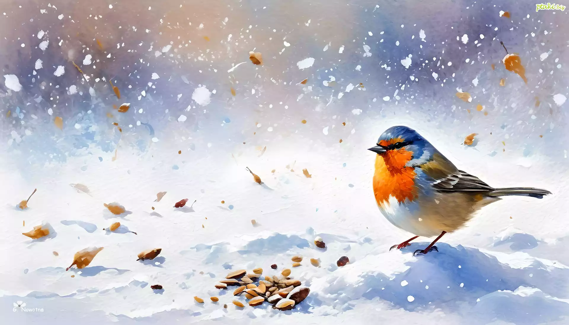 Kolorowy, Ptak, Śnieg, Ziarna, Grafika