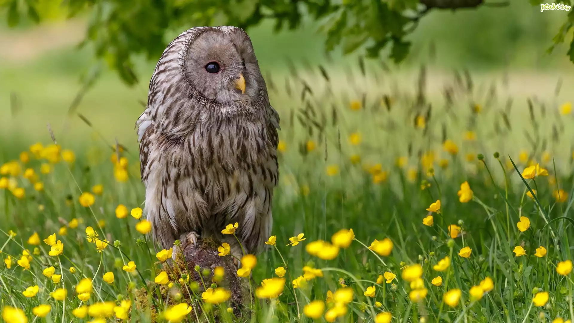 Ptak, Sowa, Puszczyk, Łąka, Trawa, Kwiaty