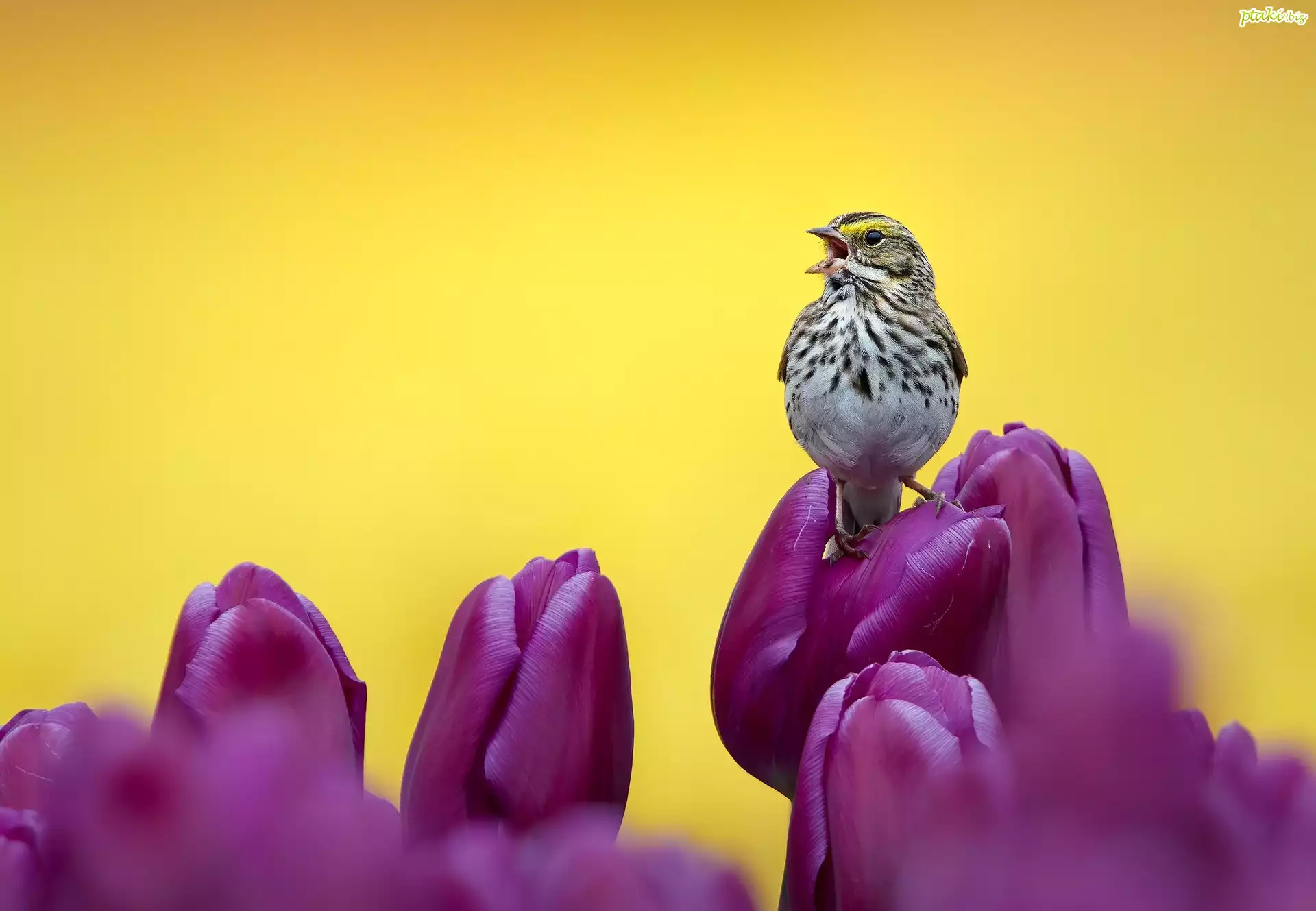 Ptak, Bagiennik żółtobrewy, Fioletowe, Tulipany, Kwiaty