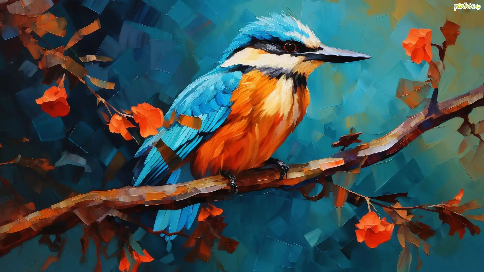 Grafika, Ptak, Zimorodek, Gałąź, Kwiaty