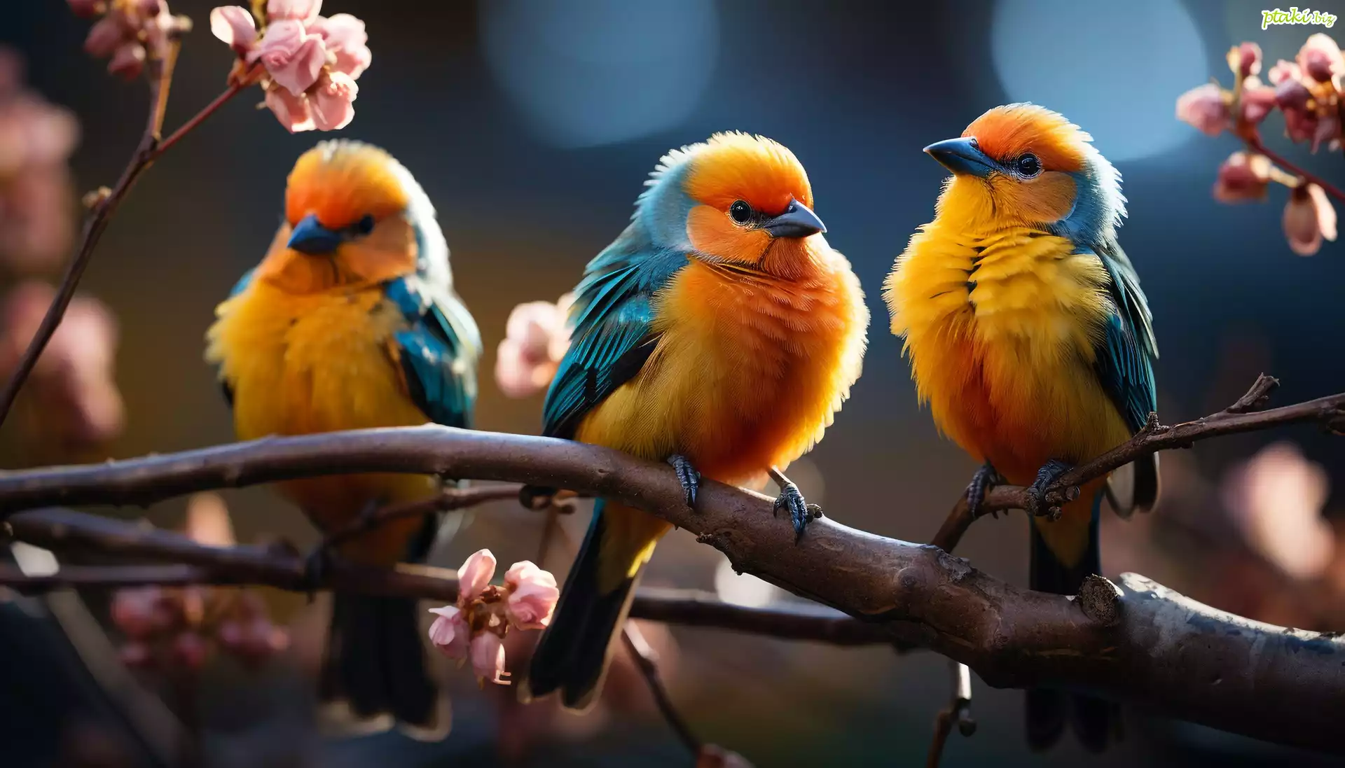 Kolorowe, Ptaki, Gałąź, Kwiaty, Grafika