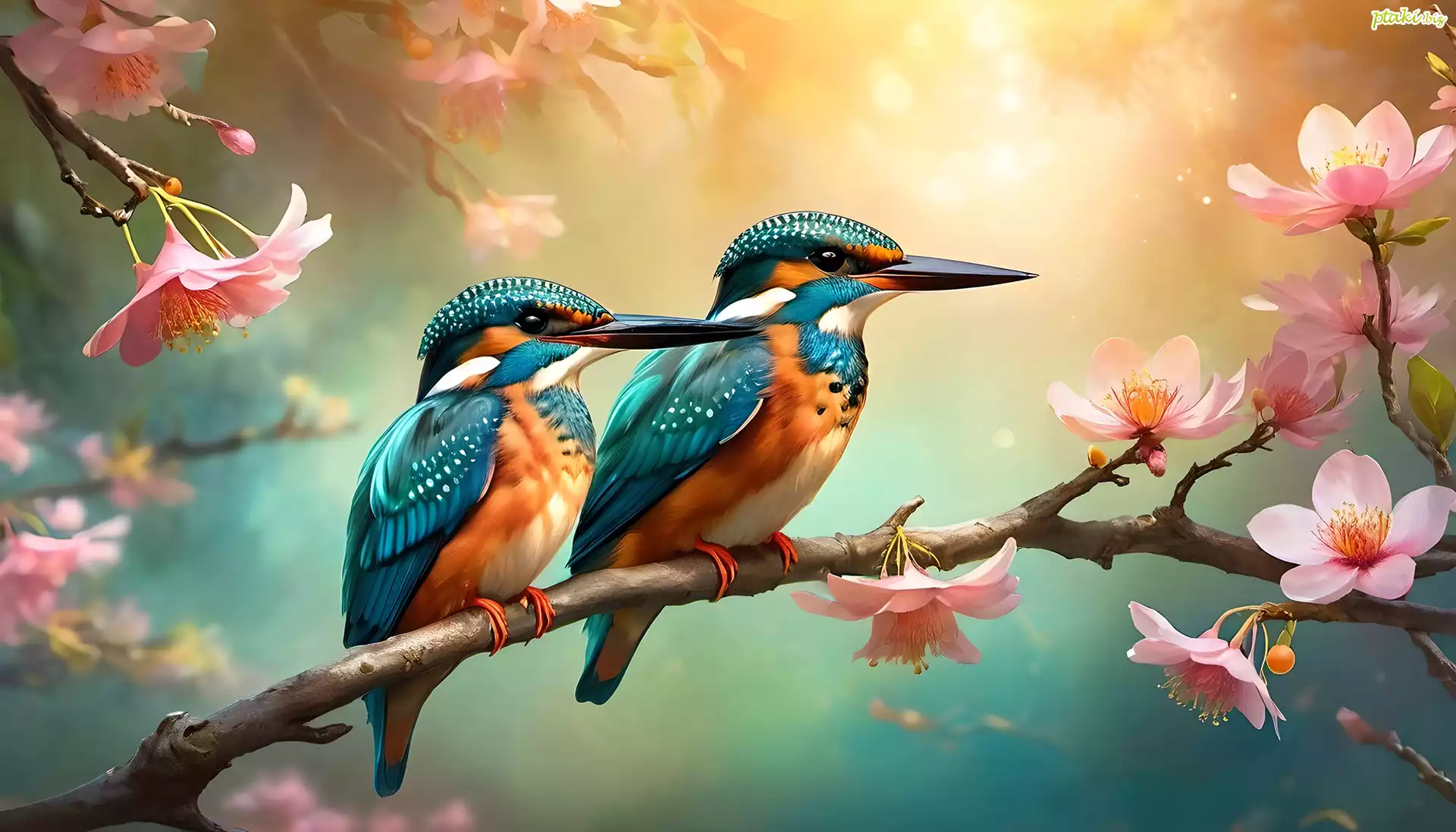 Zimorodki, Ptaki, Gałąź, Grafika, Kwiaty