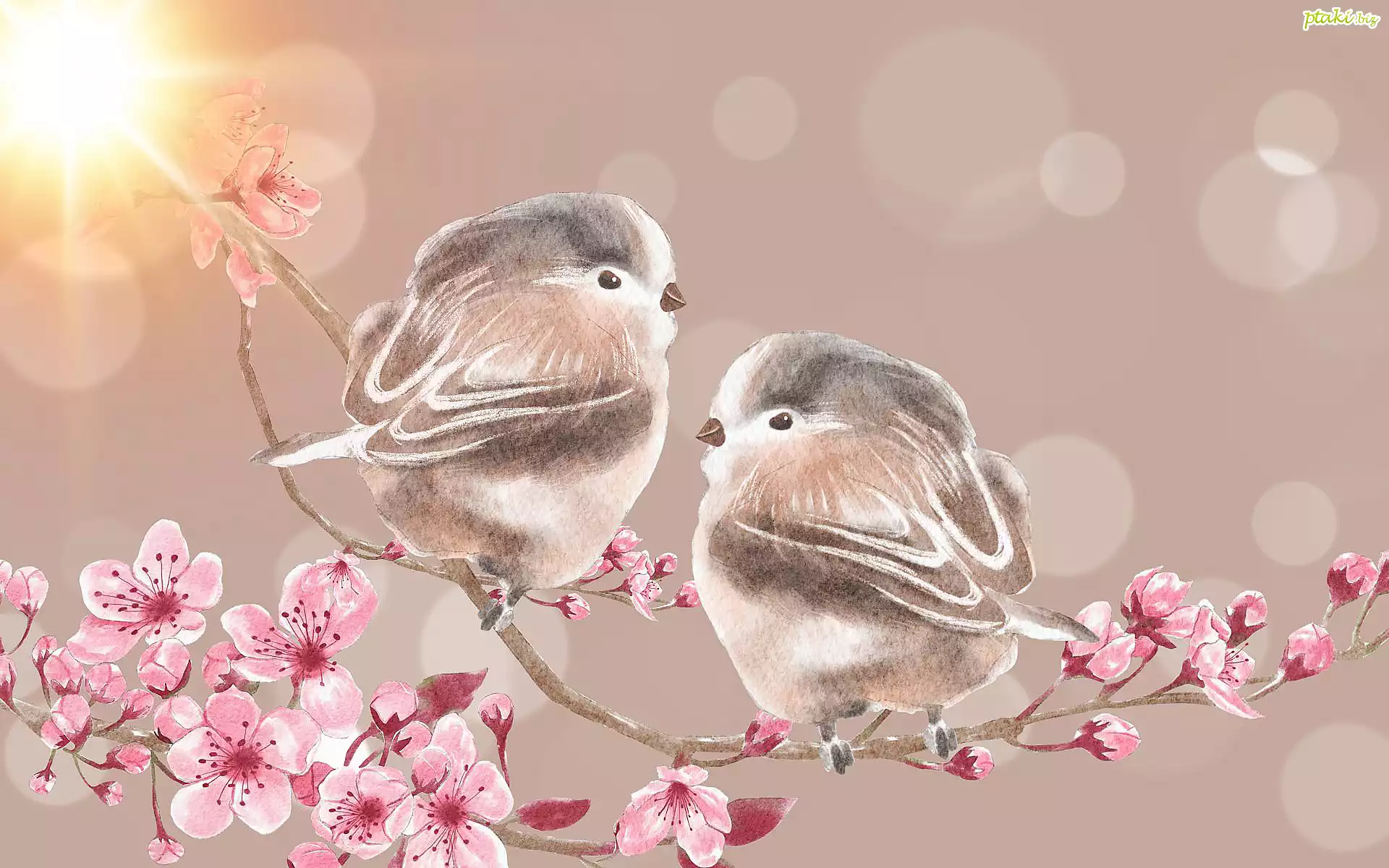 Dwa, Ptaki, Gałązka, Kwiaty, 2D