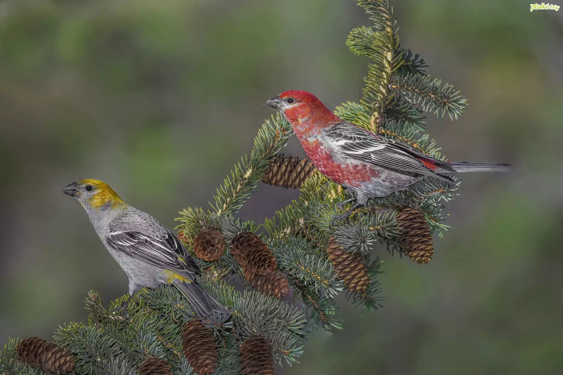 Ptaki, Krzyżodzioby, Gałązka, Szyszki