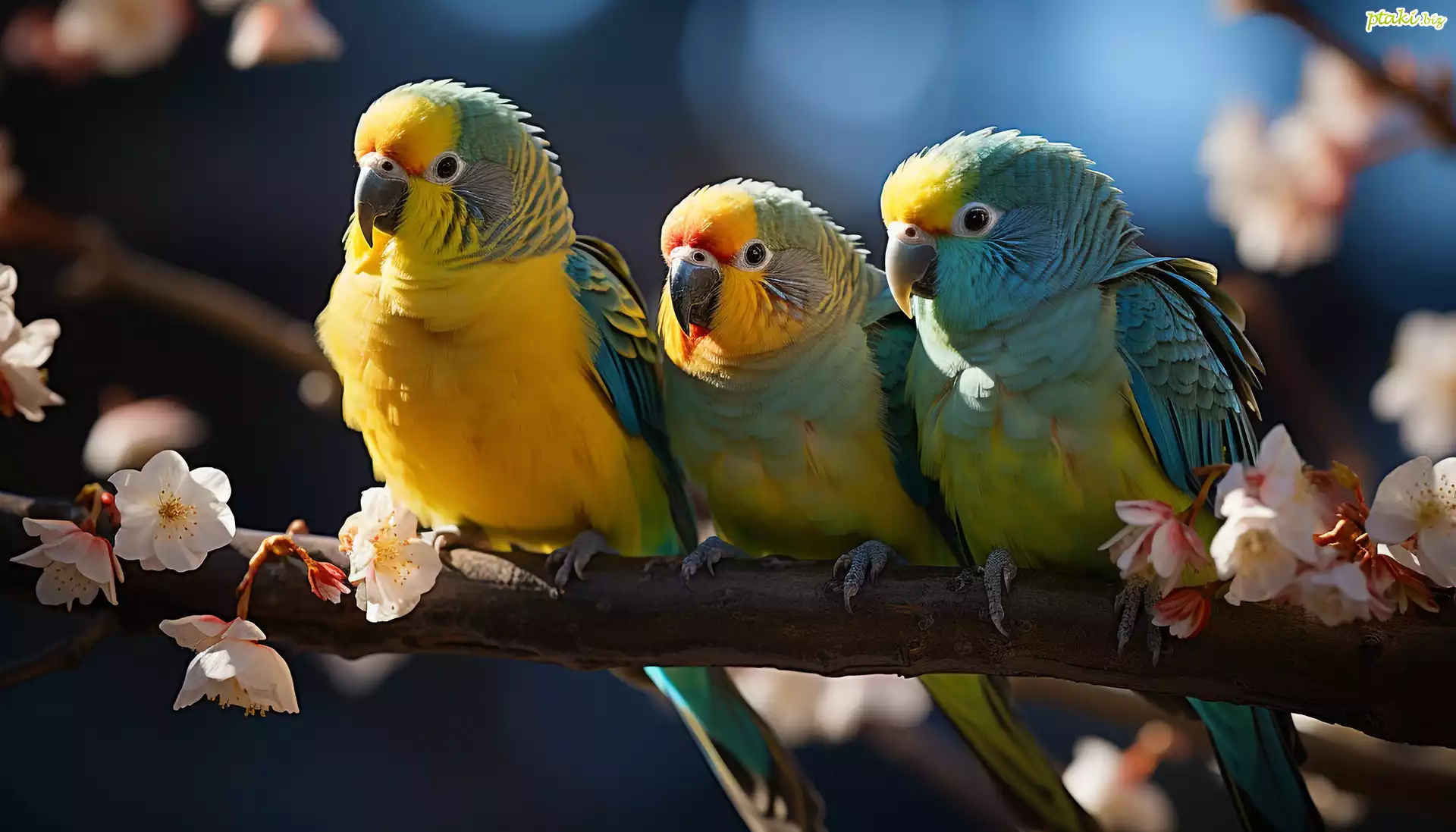 Papugi, Konury, Trzy, Ptaki, Gałąź, Kwiaty