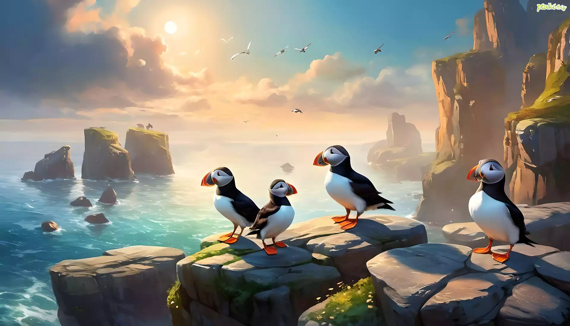 Cztery, Ptaki, Maskonury, Skała, Grafika