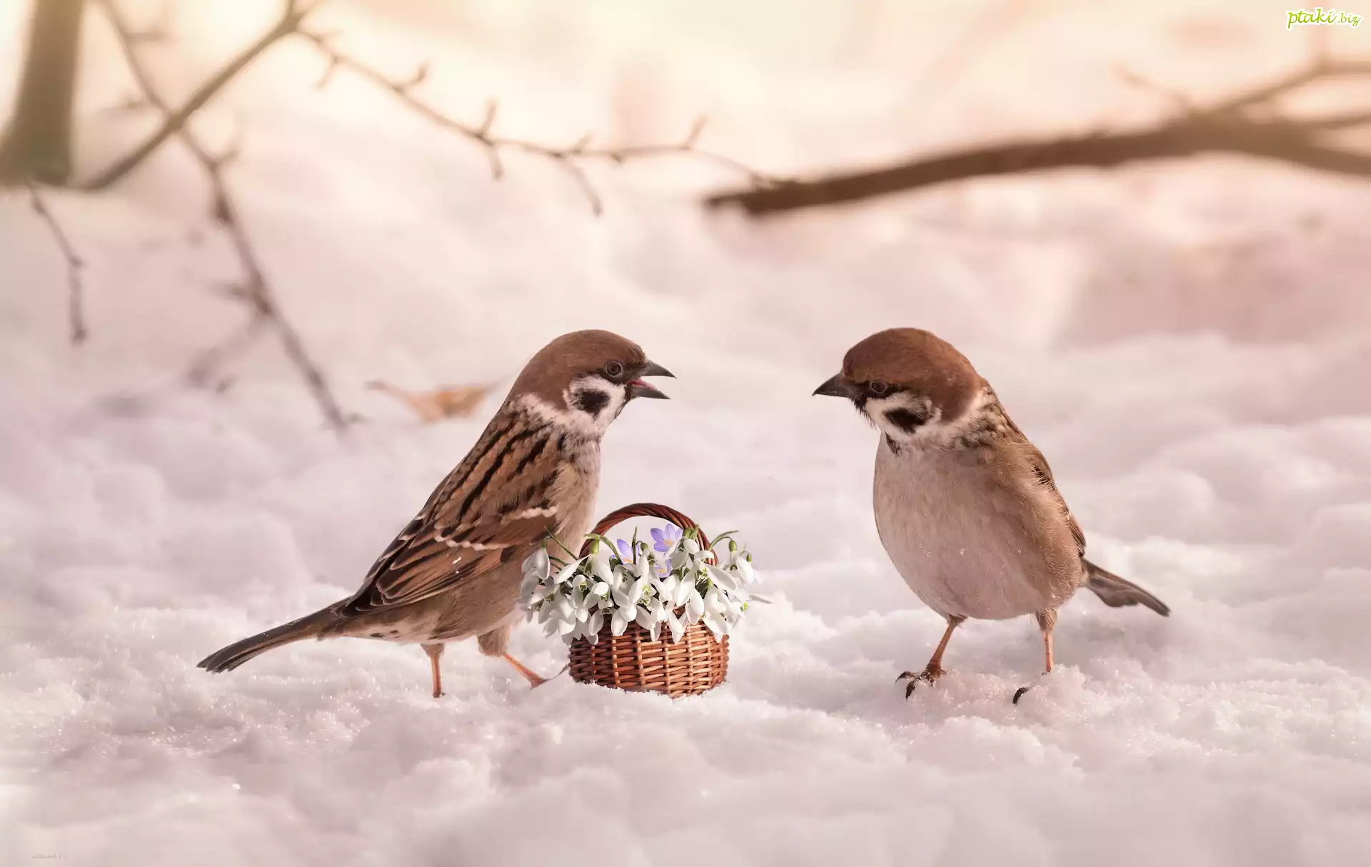 Dwa, Ptaki, Wróble, Kwiaty, Przebiśniegi, Koszyk, Zima, Śnieg