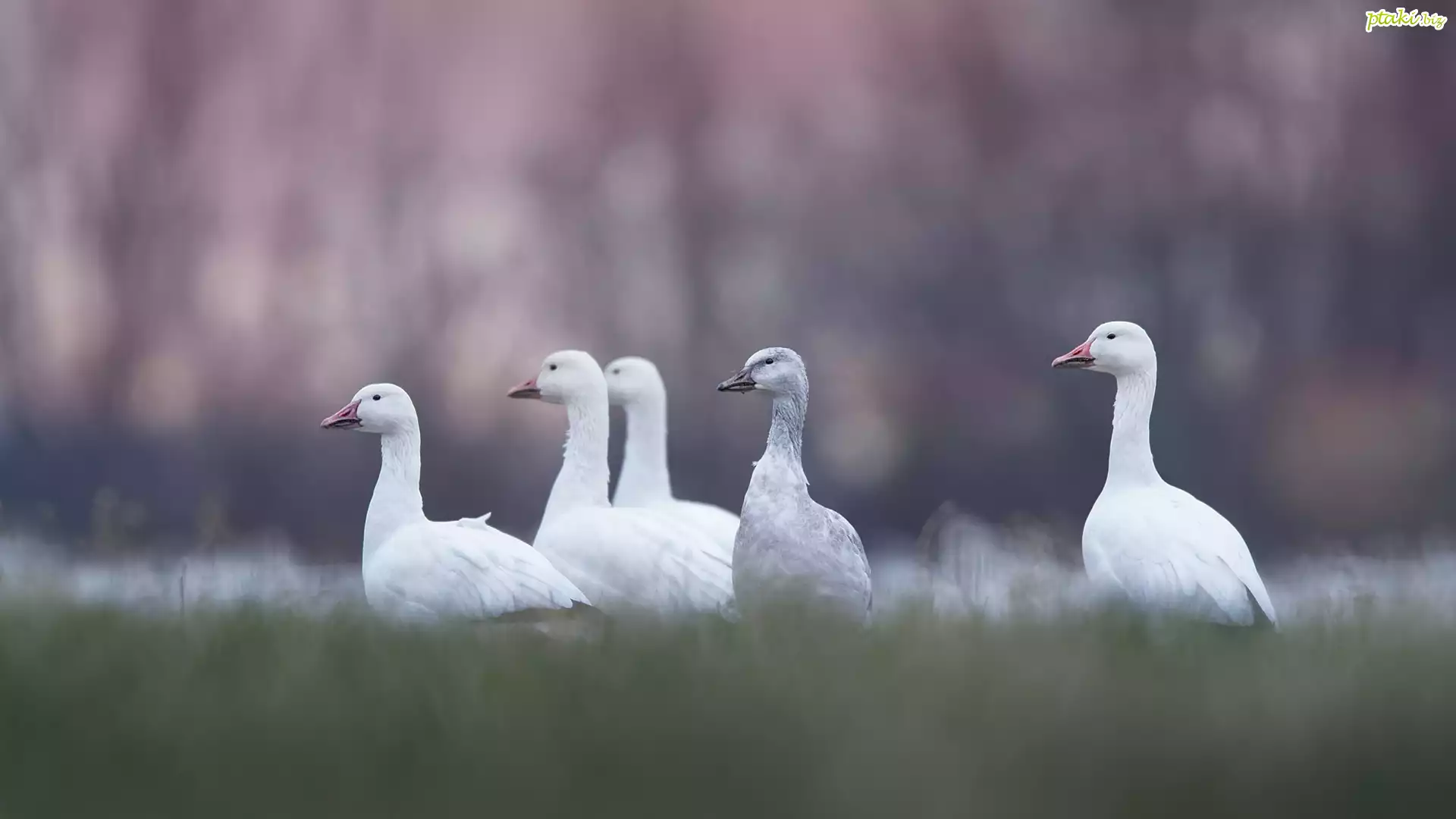 Ptaki, Gęsi, Śnieżyce duże, Trawa, Rozmycie