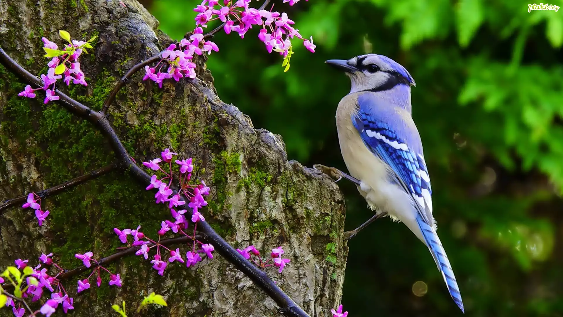 Ptaszek, Modrosójka, Skała, Gałązka, Kwiatowa