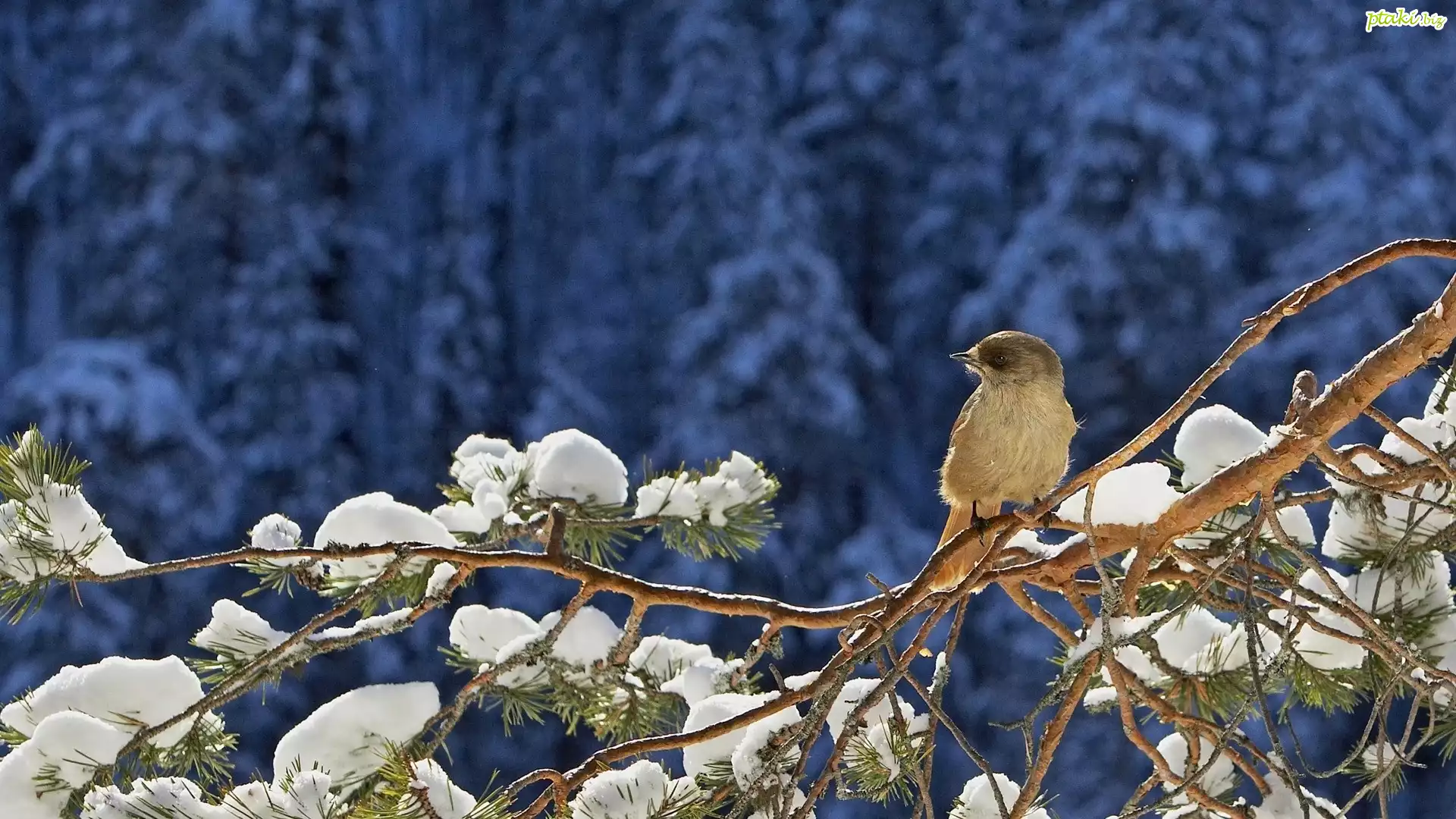 Ptaszek, Zima, Gałązka, Iglaka, Śnieg