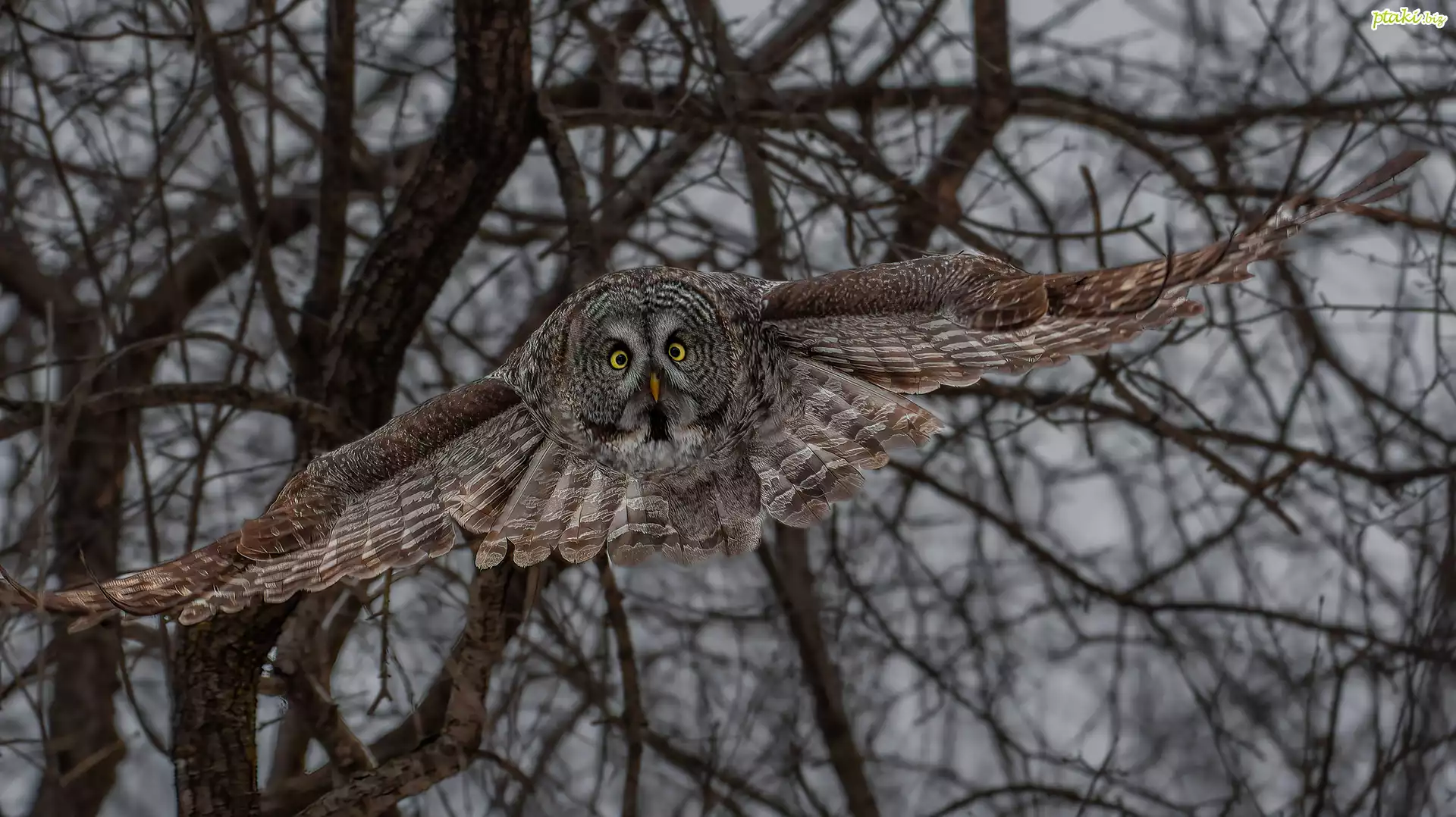 Lecący, Ptak, Sowa, Puszczyk mszarny, Gałęzie