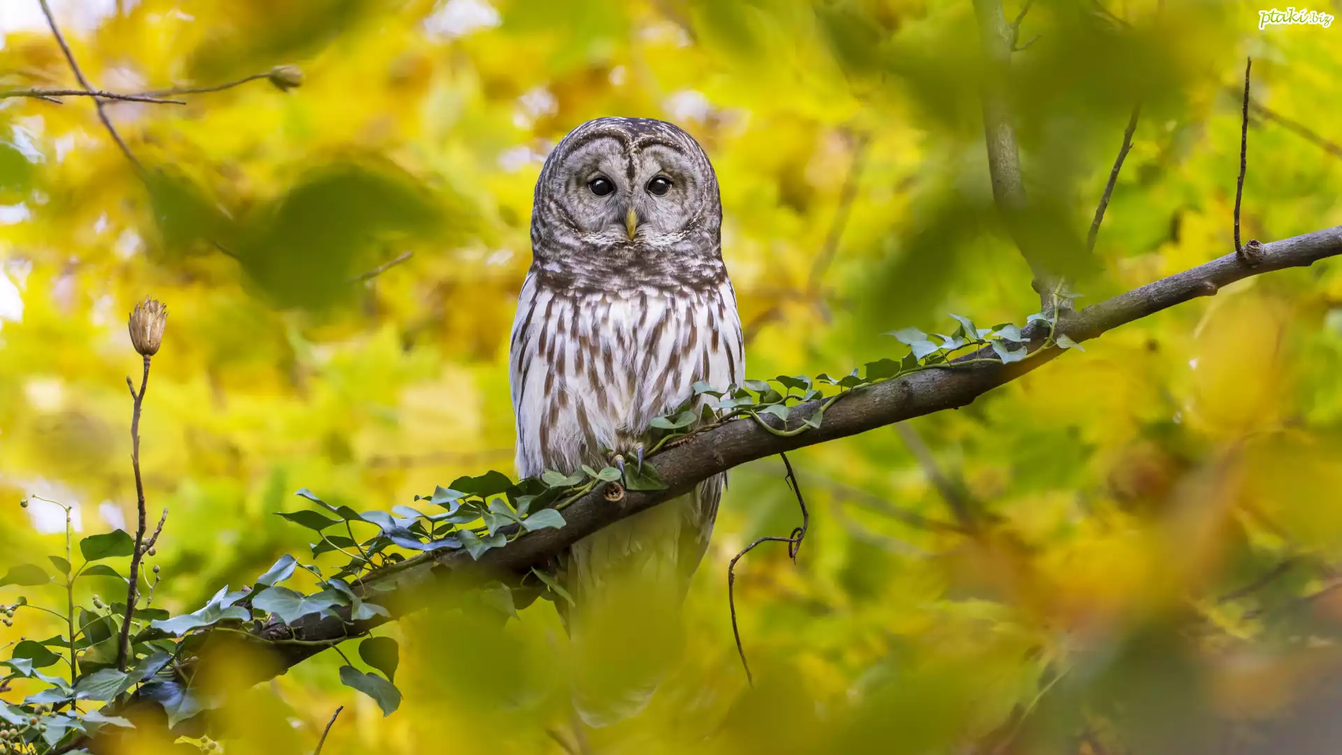 Sowa, Puszczyk, Konar, Listki, Rośliny