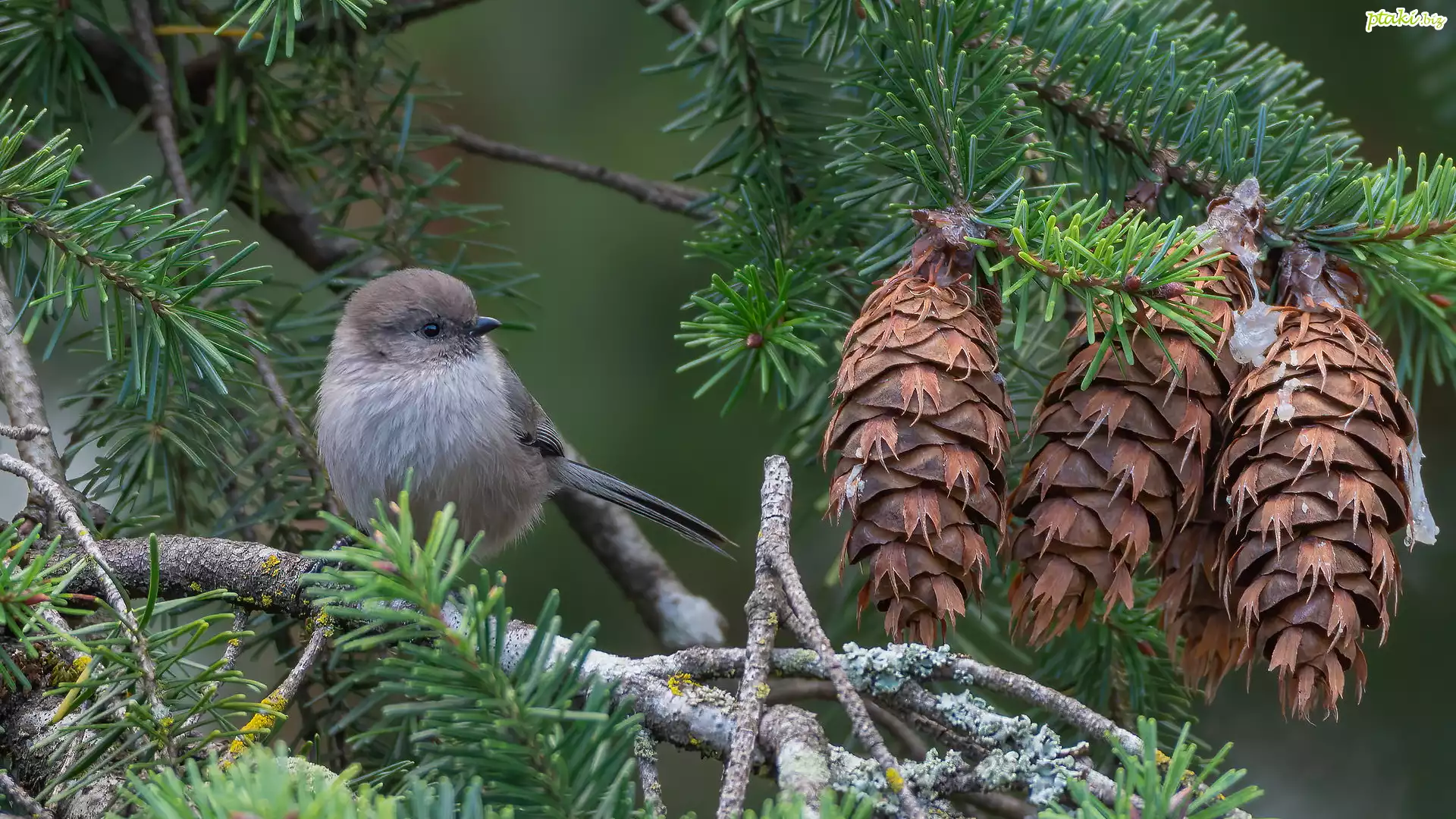Ptak, Raniuszek amerykański, Gałązki, Drzewo, Daglezja zielona, Szyszki