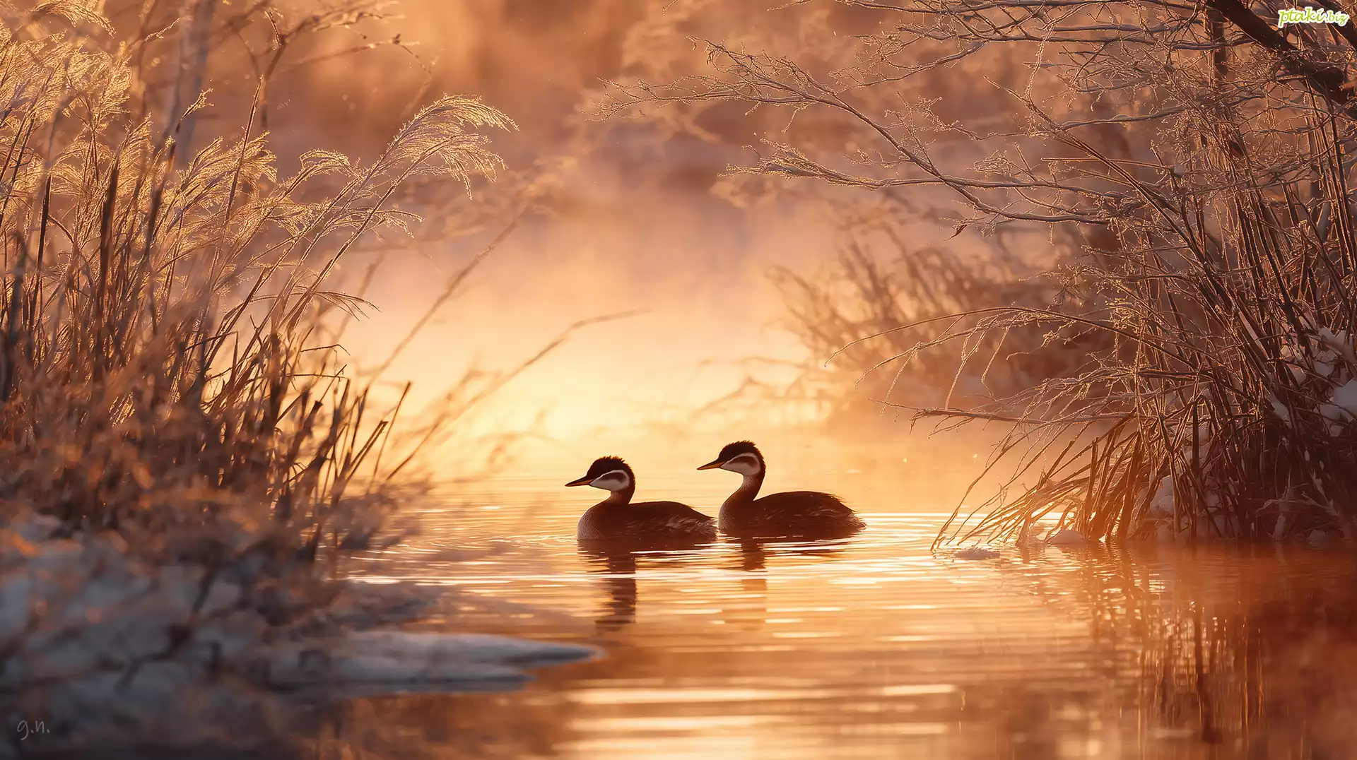 Dwa, Perkozy rdzawoszyje, Woda, Zarośla, Grafika AI, Roślinność
