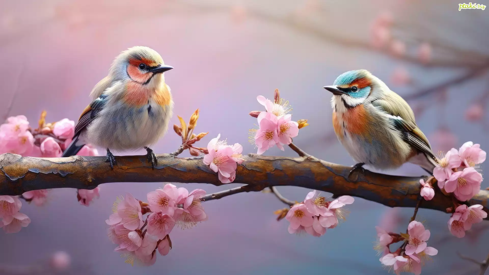 Dwa, Ptaki, Gałąź, Różowe, Kwiaty, Grafika
