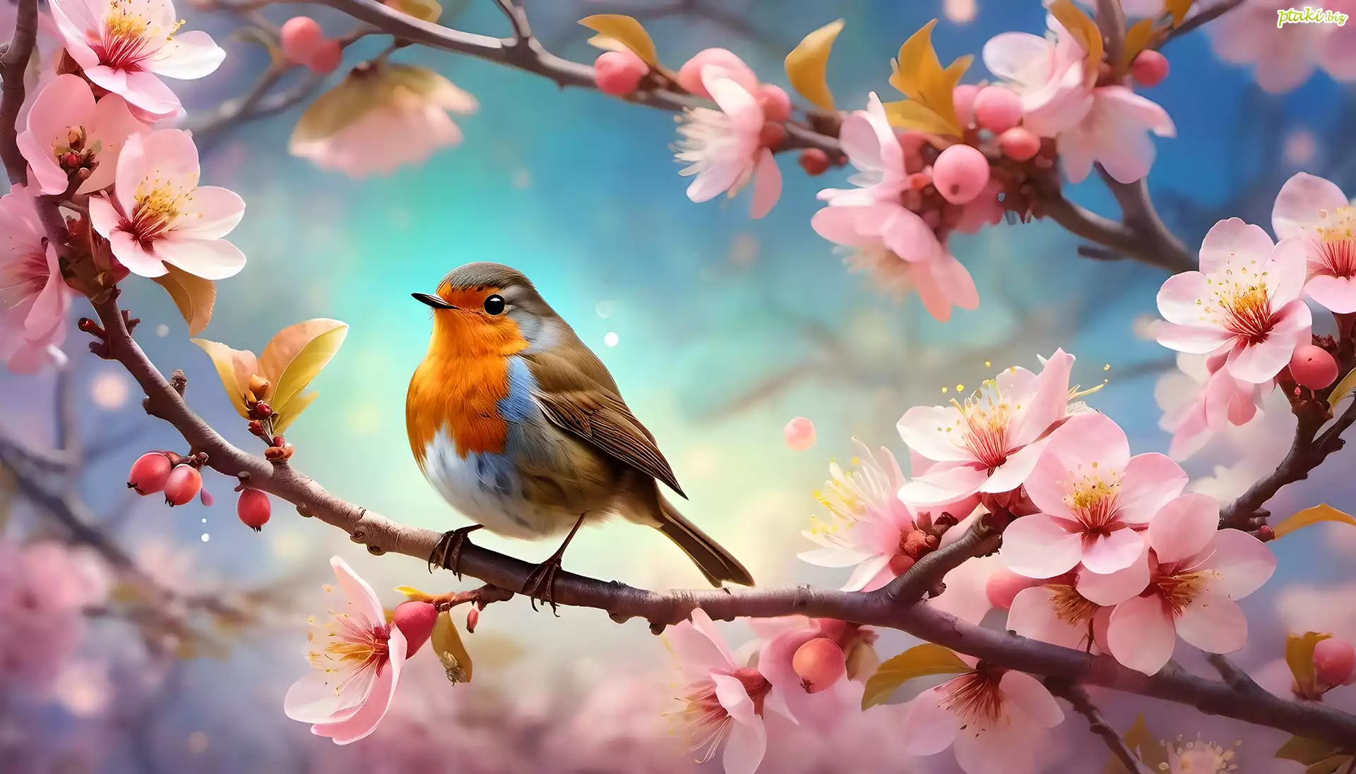 Rudzik, Ptak, Gałąź, Różowe, Kwiaty, Grafika
