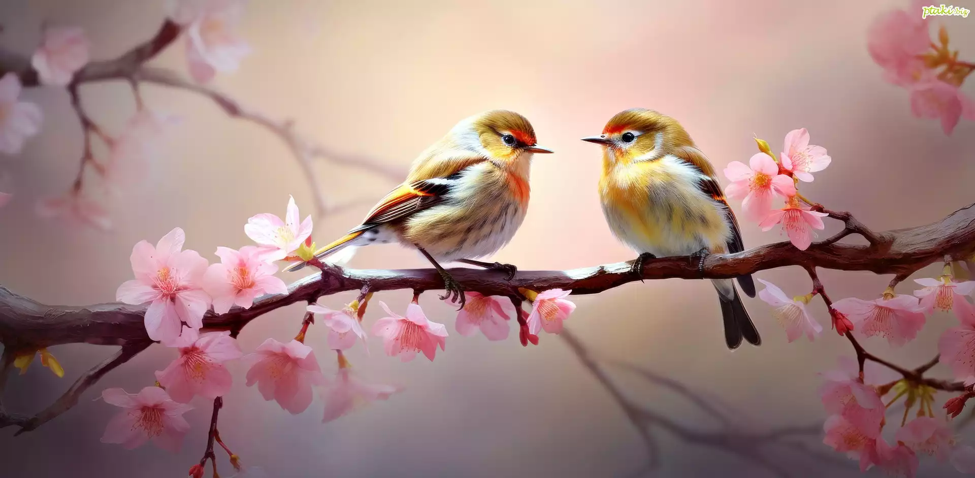 Ptaki, Kolorowe, Gałązka, Różowe, Kwiaty, Grafika