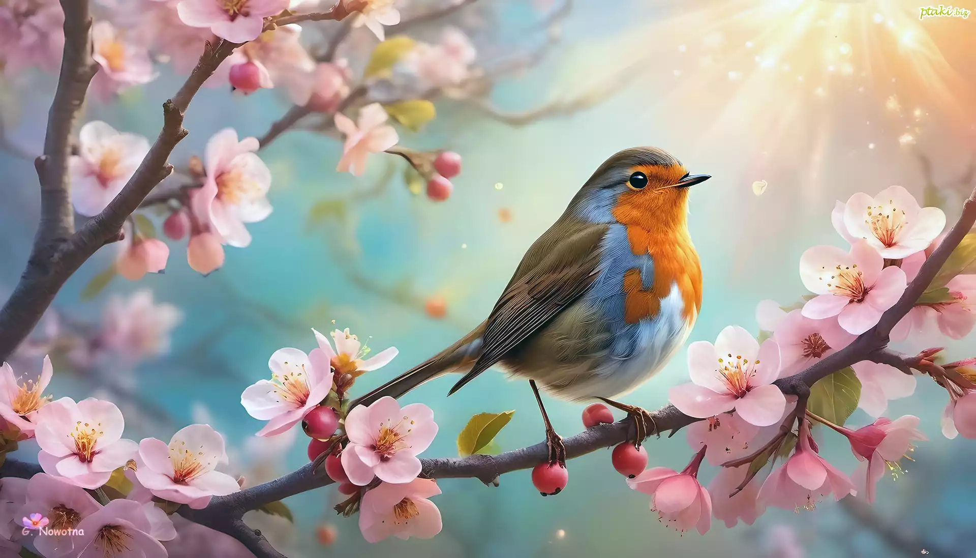 Rudzik, Ptak, Gałązka, Różowe, Kwiaty, Grafika