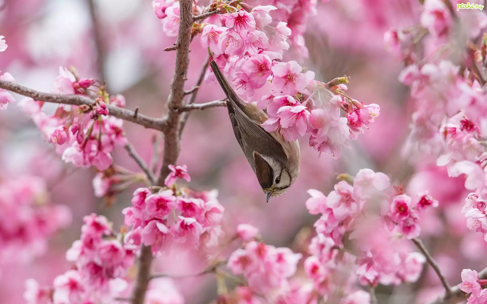 Gałęzie, Różowe, Kwiaty, Drzewo owocowe, Wiśnia japońska, Ptak