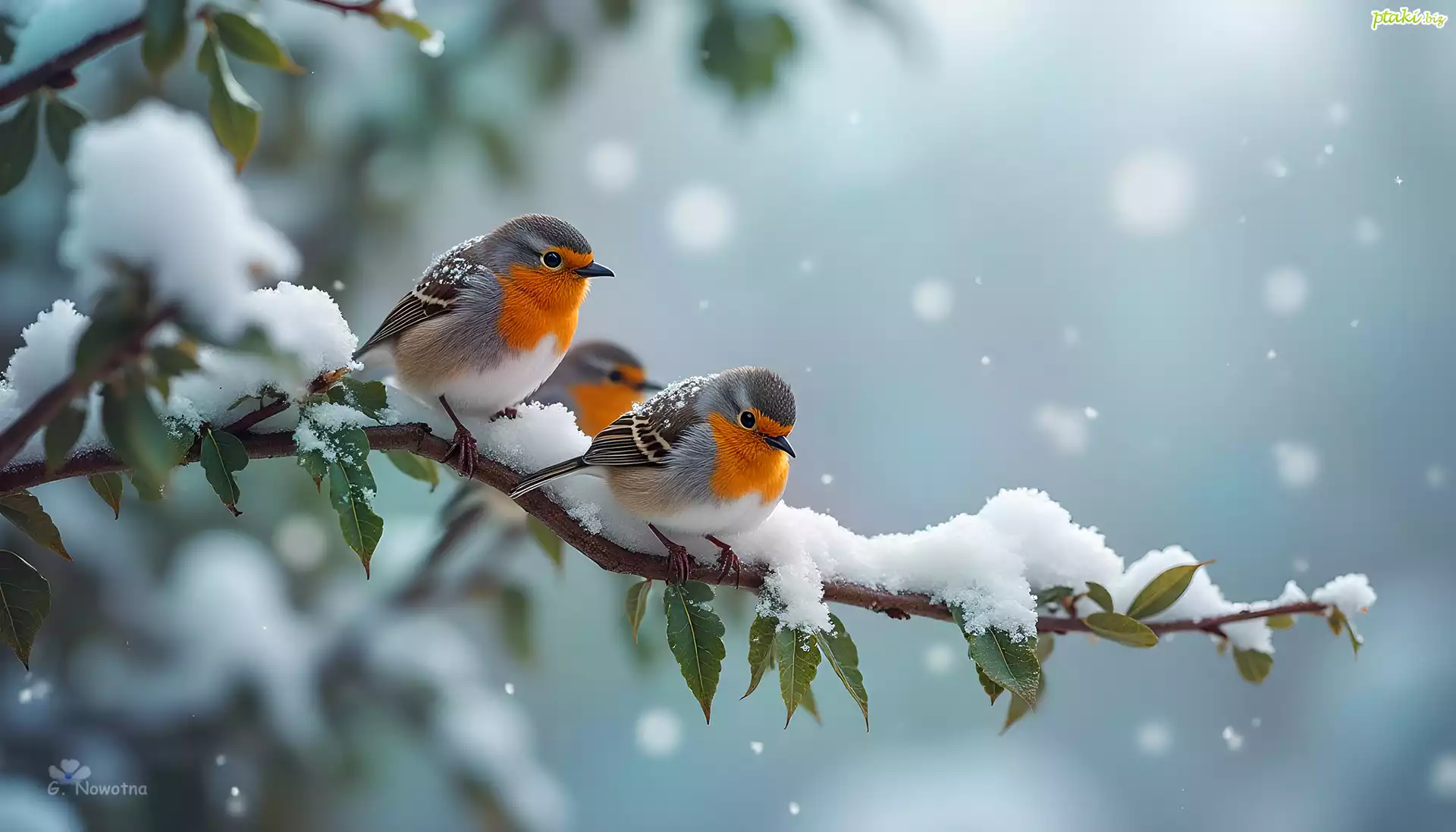 Ptaki, Rudziki, Gałąź, Śnieg, Grafika