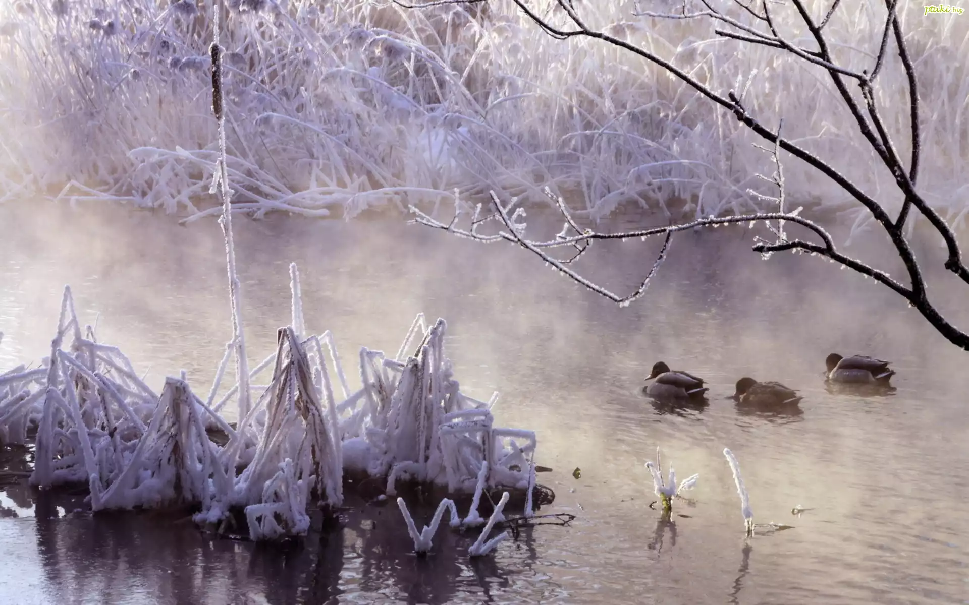 Rzeka, Drzewa, Kaczki, Zima