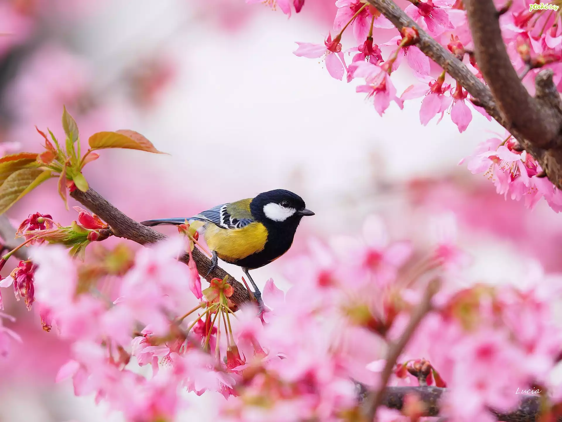 Ptak, Sikorka, Bogatka zwyczajna, Kwitnące, Drzewo, Różowe, Kwiaty