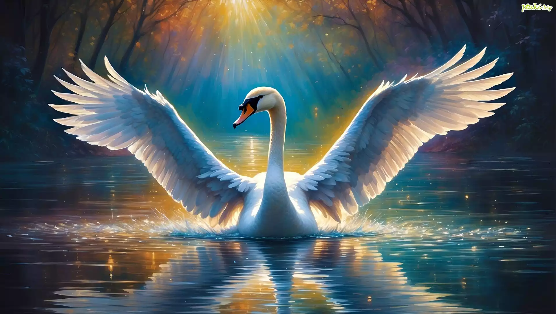 Ptak, Biały, Łabędź, Skrzydła, Woda, Promienie, Grafika