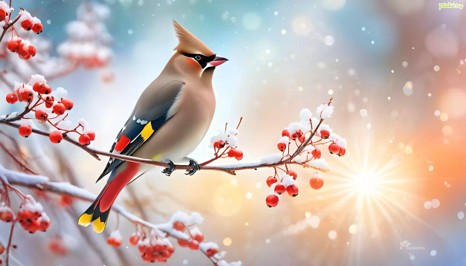 Jemiołuszka, Ptak, Jarzębina, Śnieg, Zima, Grafika