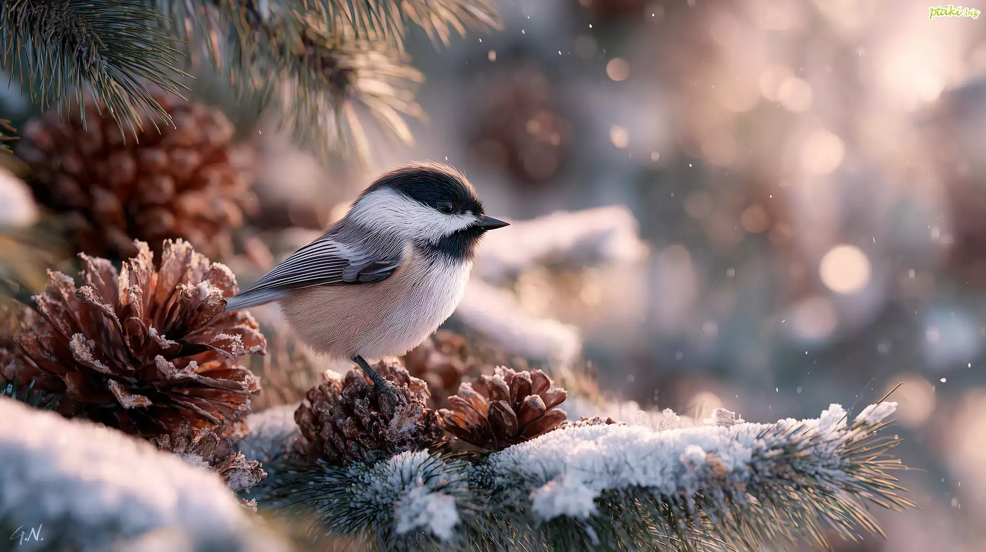 Sikorka czarnogłówka, Szyszki, Sosna, Zima, Grafika AI