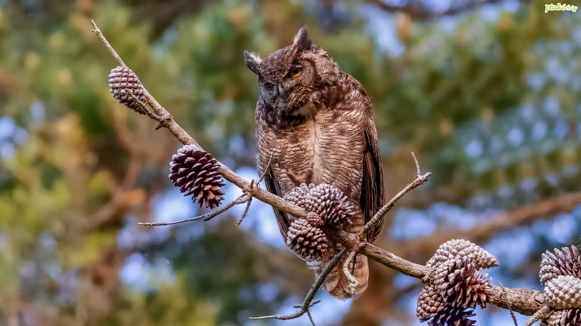 Sowa, Puchacz wirginijski, Gałązka, Szyszki