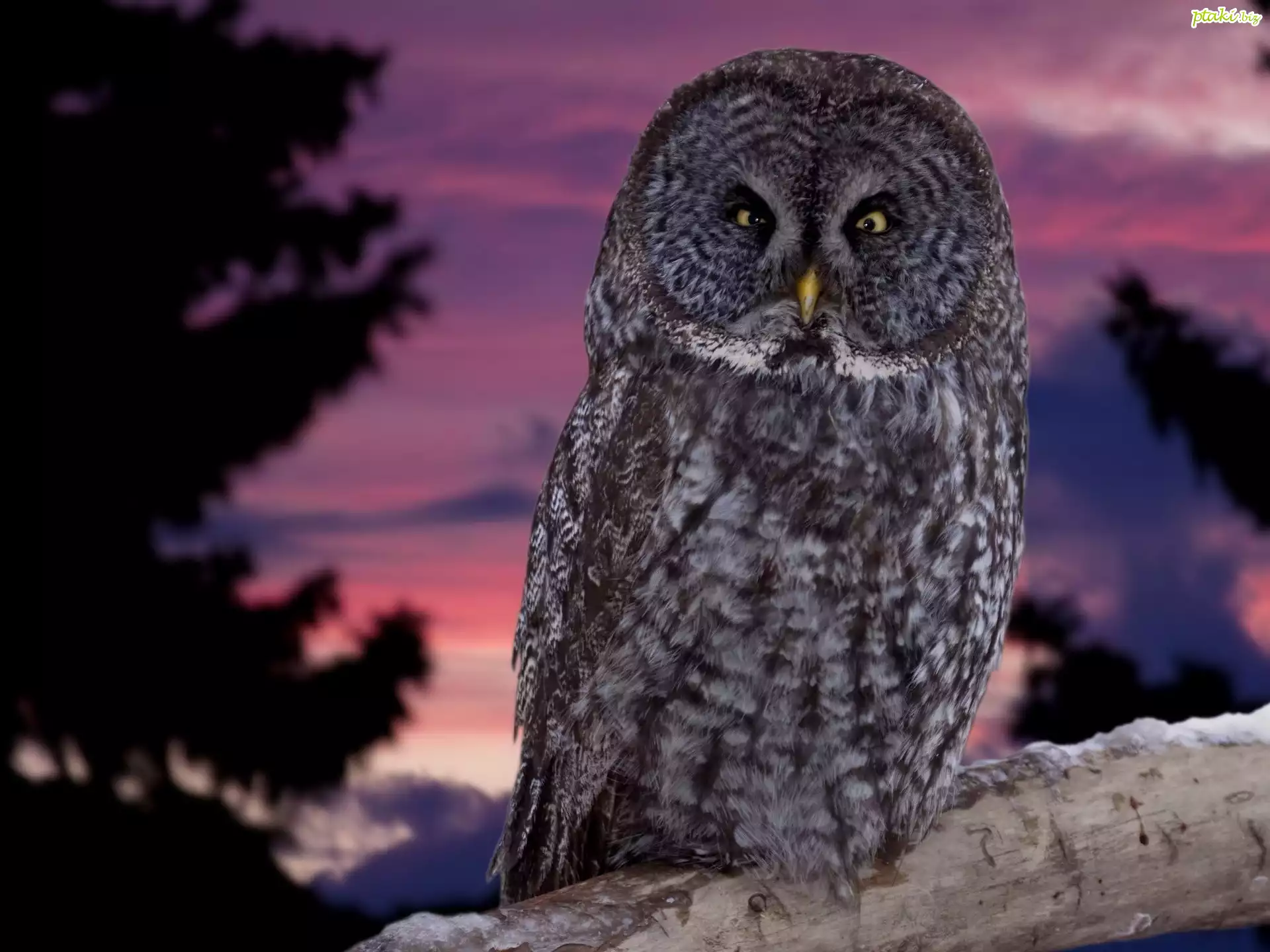 Sowa, Puszczyk mszarny, Zachód słońca, Drzewa