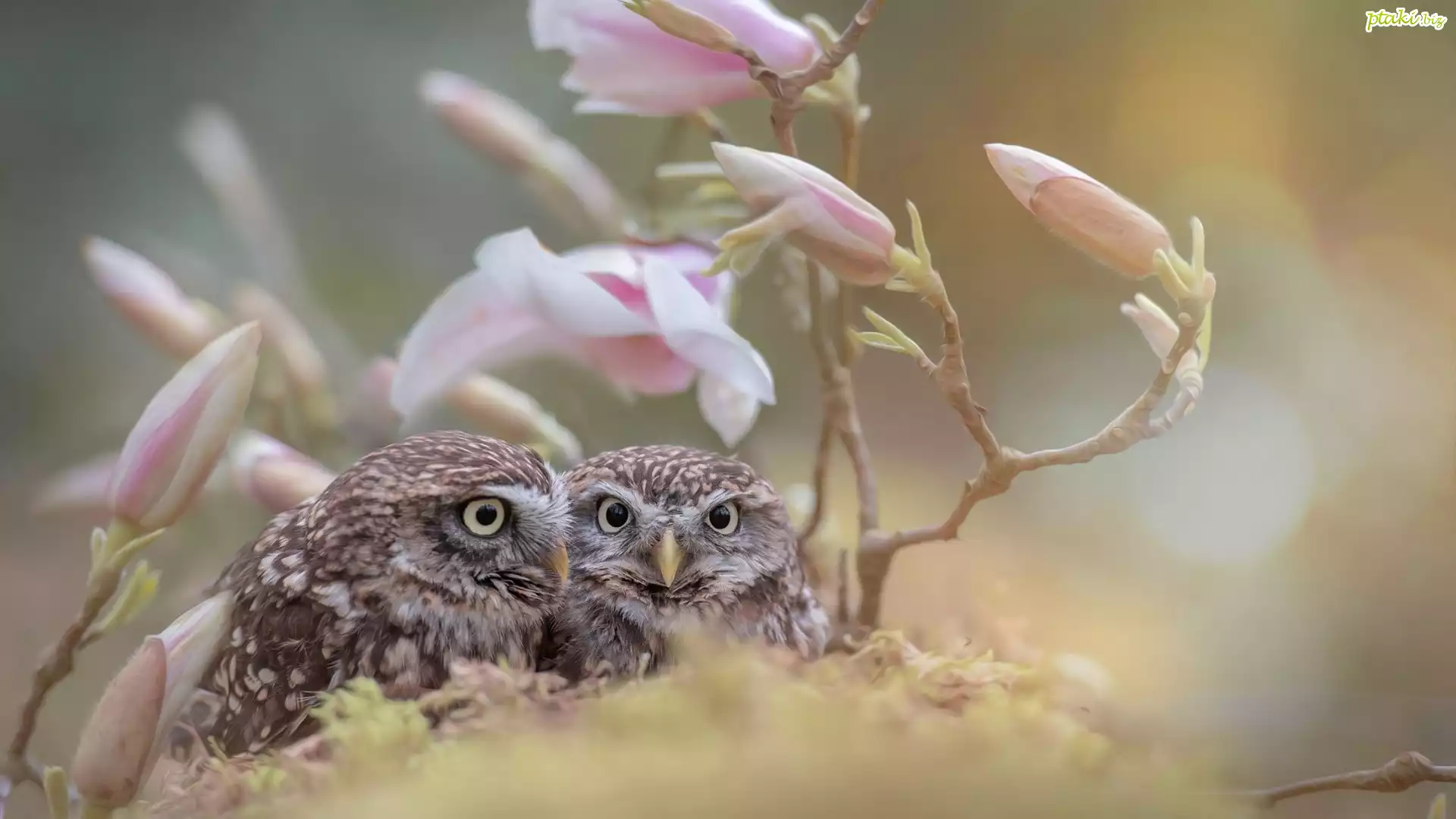 Sowy, Pójdźki, Magnolia, Rozmyte, Tło