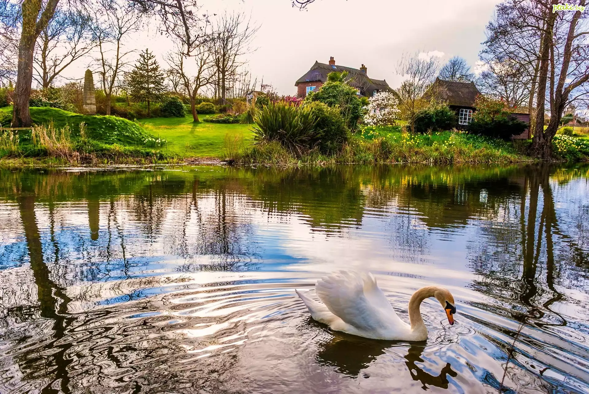 Staw, Łabędź, Domki, Wieś, Wiosna