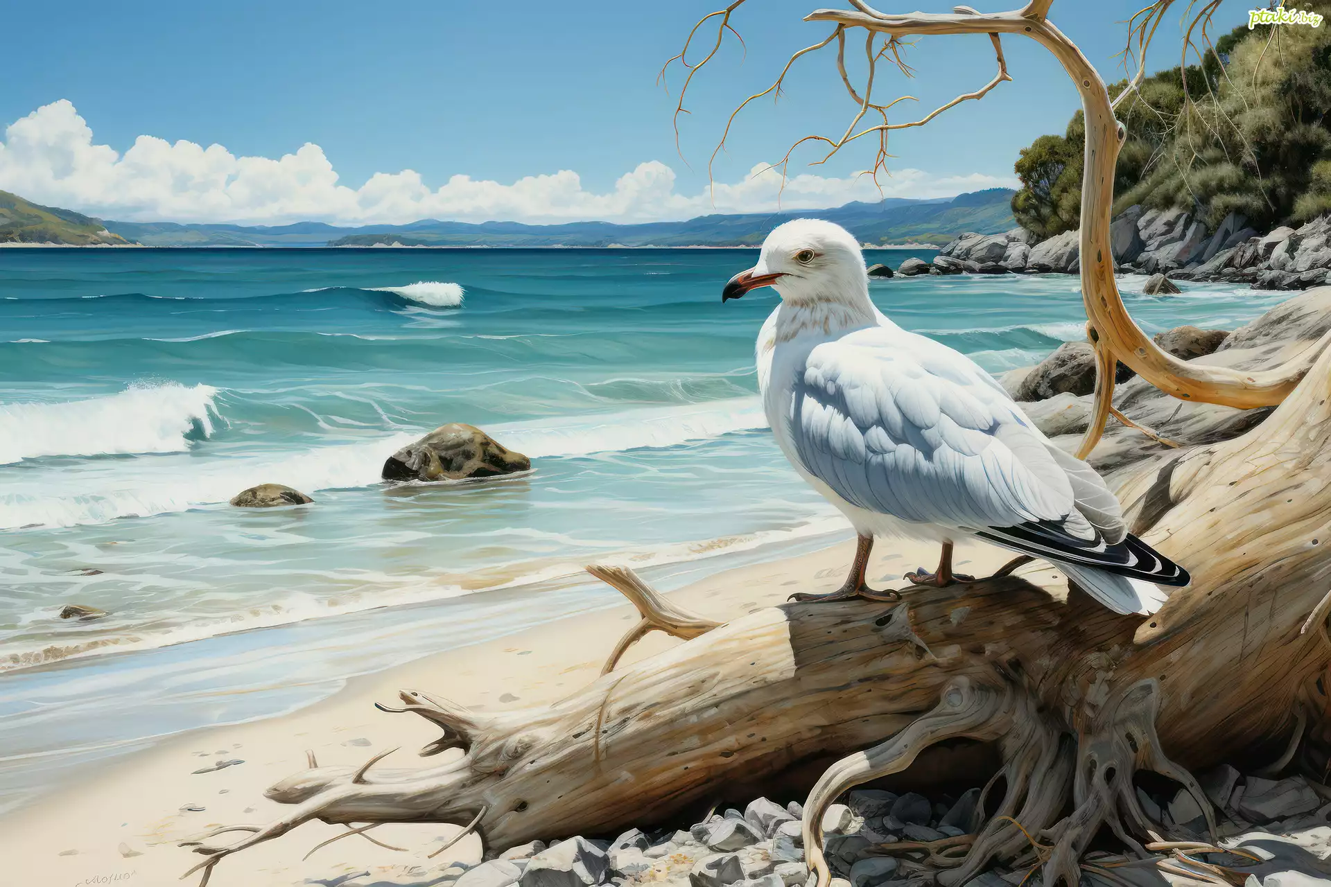 Morze, Mewa, Plaża, Suche, Drzewo, Grafika