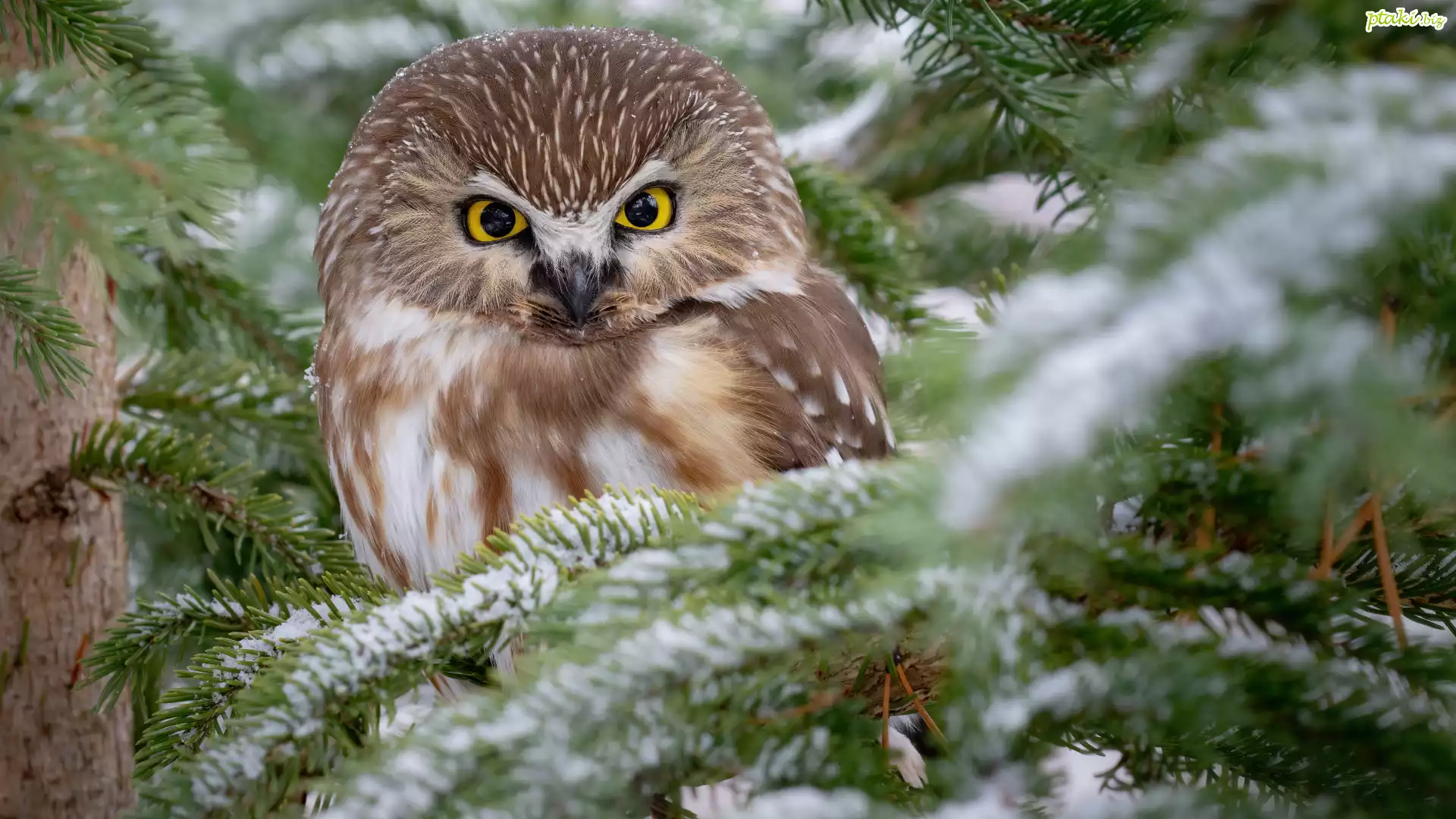 Sowa, Włochatka, Drzewo, Świerk, Ośnieżone, Gałązki