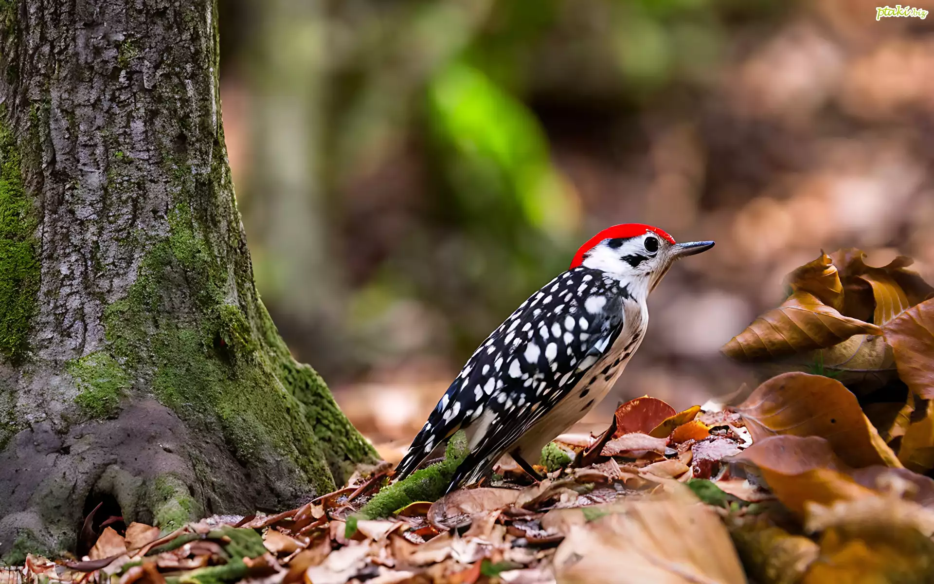 Ptak, Dzięcioł, Omszałe, Drzewo, Suche, Liście, Rozmyte tło