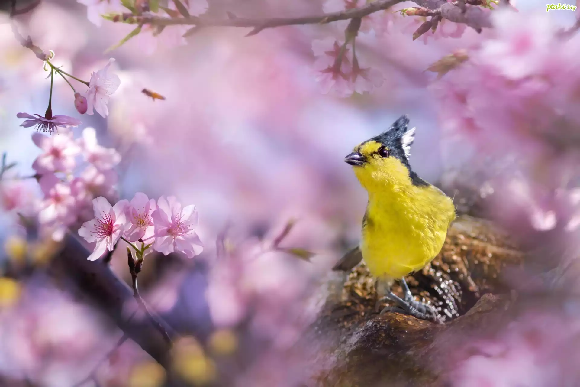 Ptak, Sikora żółtogardła, Gałąź, Kwitnące, Drzewo, Wiśnia, Rozmyte tło