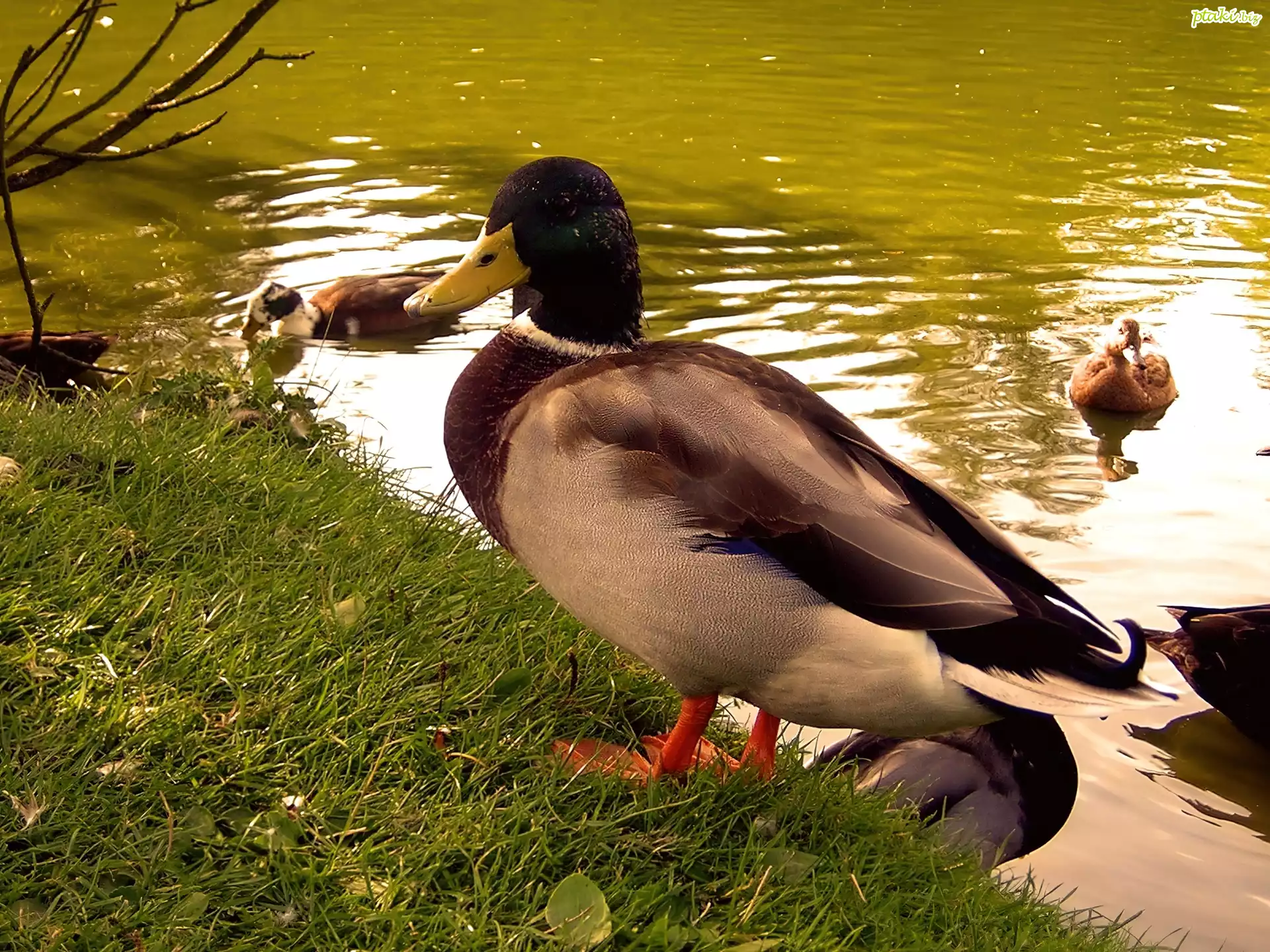 Kaczki, Trawa, Woda