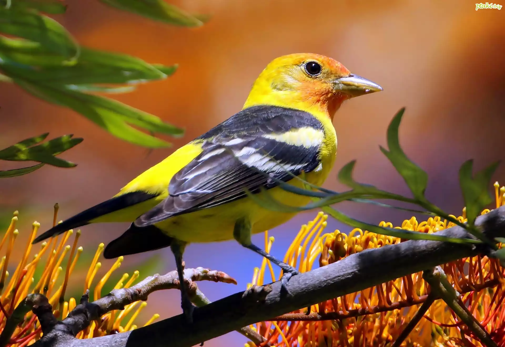Żółty, Ptak, Gałąz, Światło, Kwiaty
