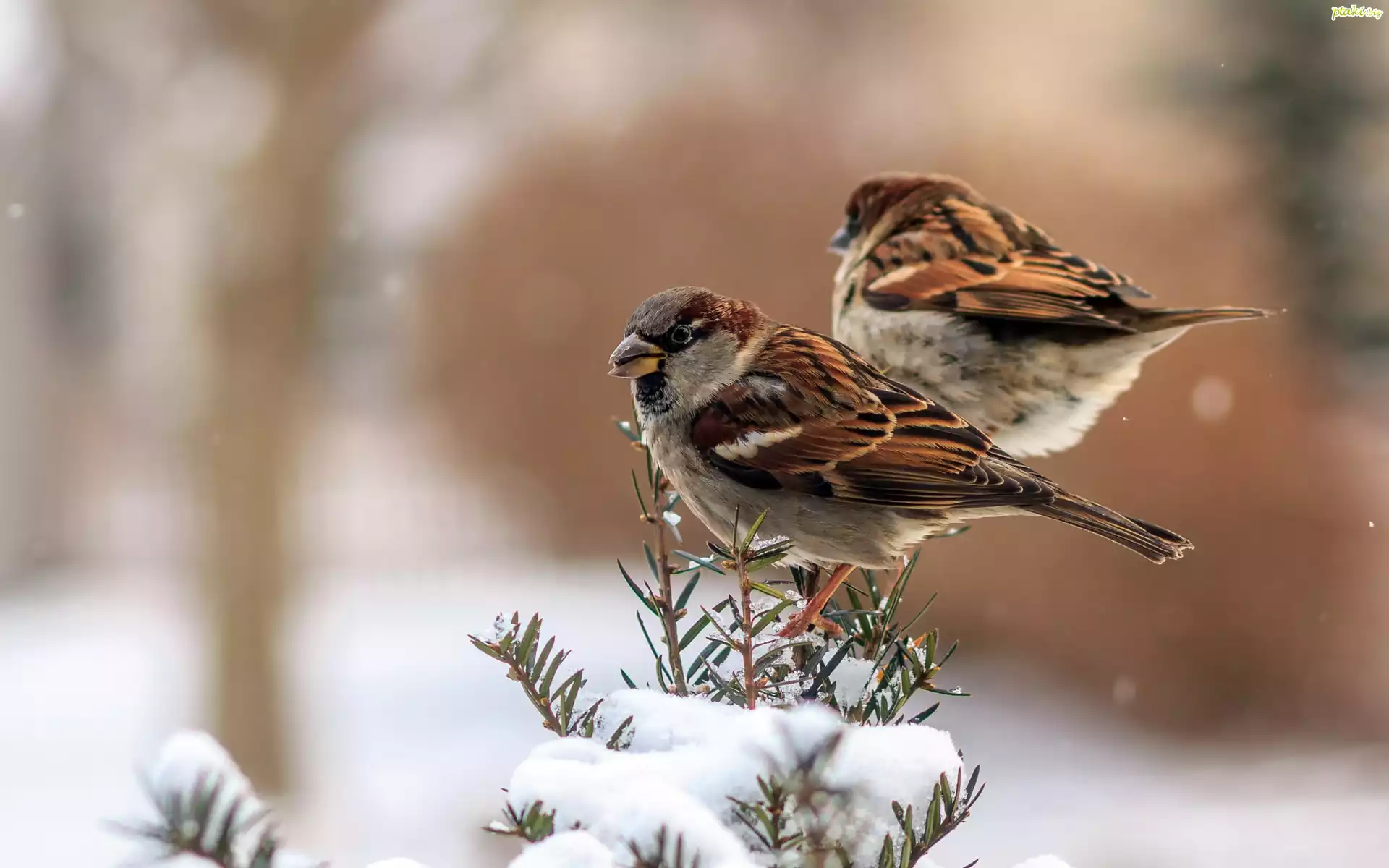 Wróble, Wróbelki, Ptaki, Gałązki, Śnieg
