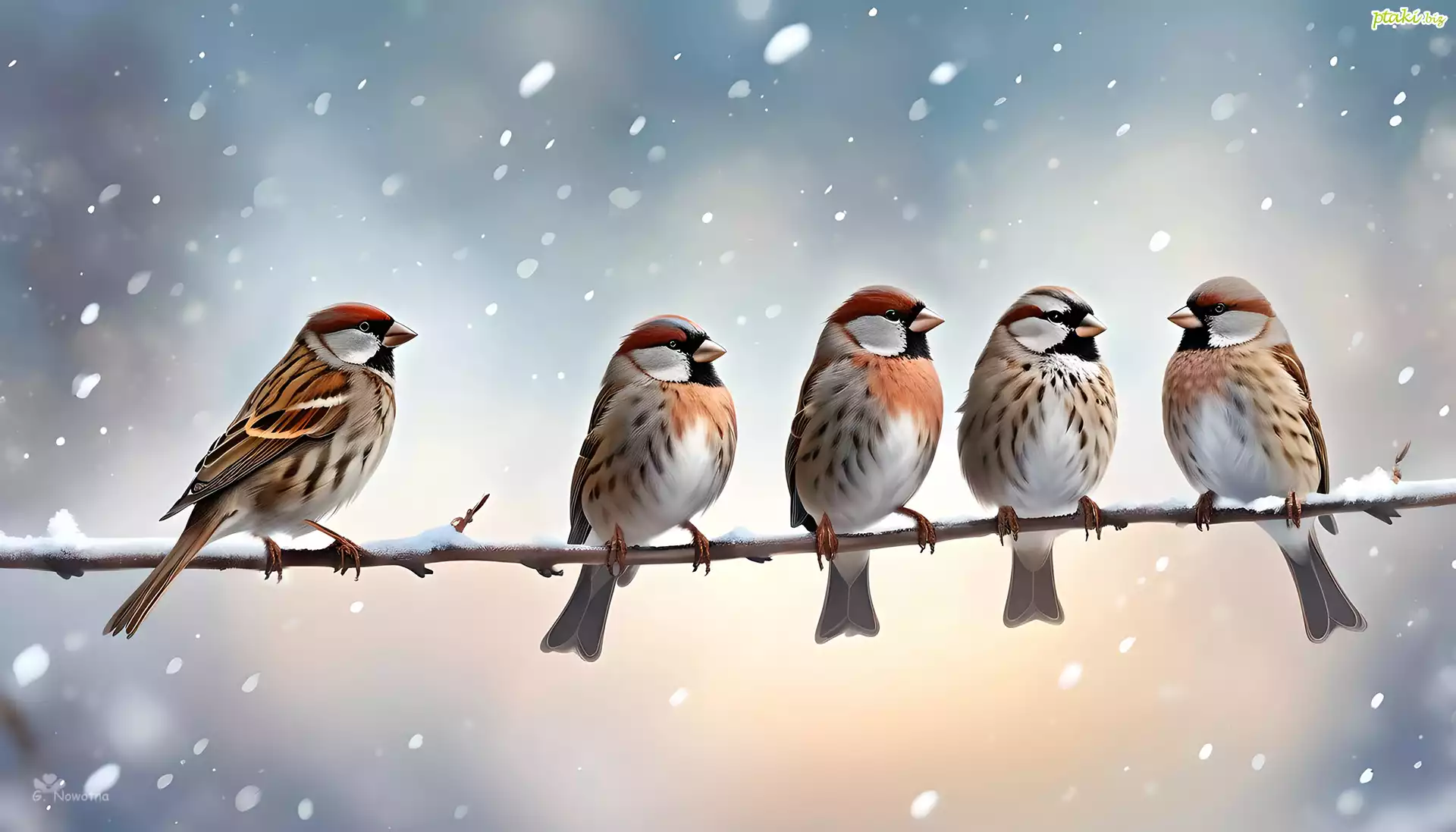 Ptaki, Wróblowate, Gałązka, Śnieg, Grafika