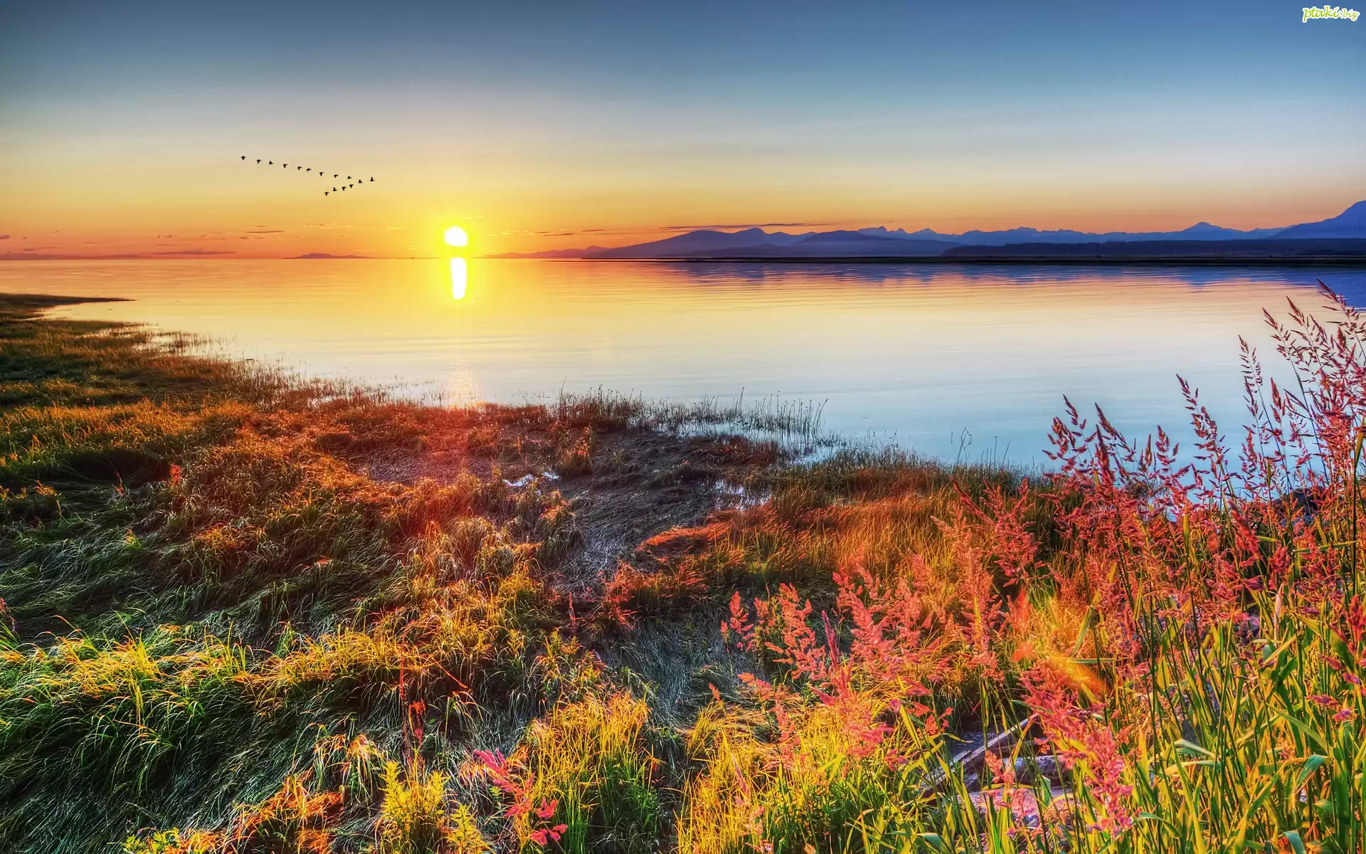Wschód, Słońca, Jezioro, Klucz, Ptaków