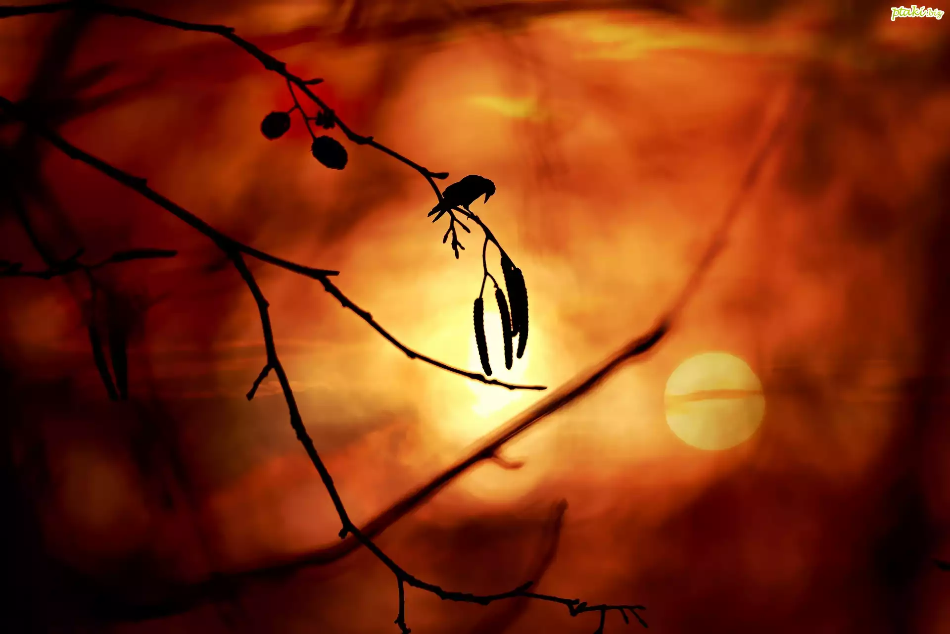 Zachód słońca, Gałęzie, Olsza, Gałązki, Ptak