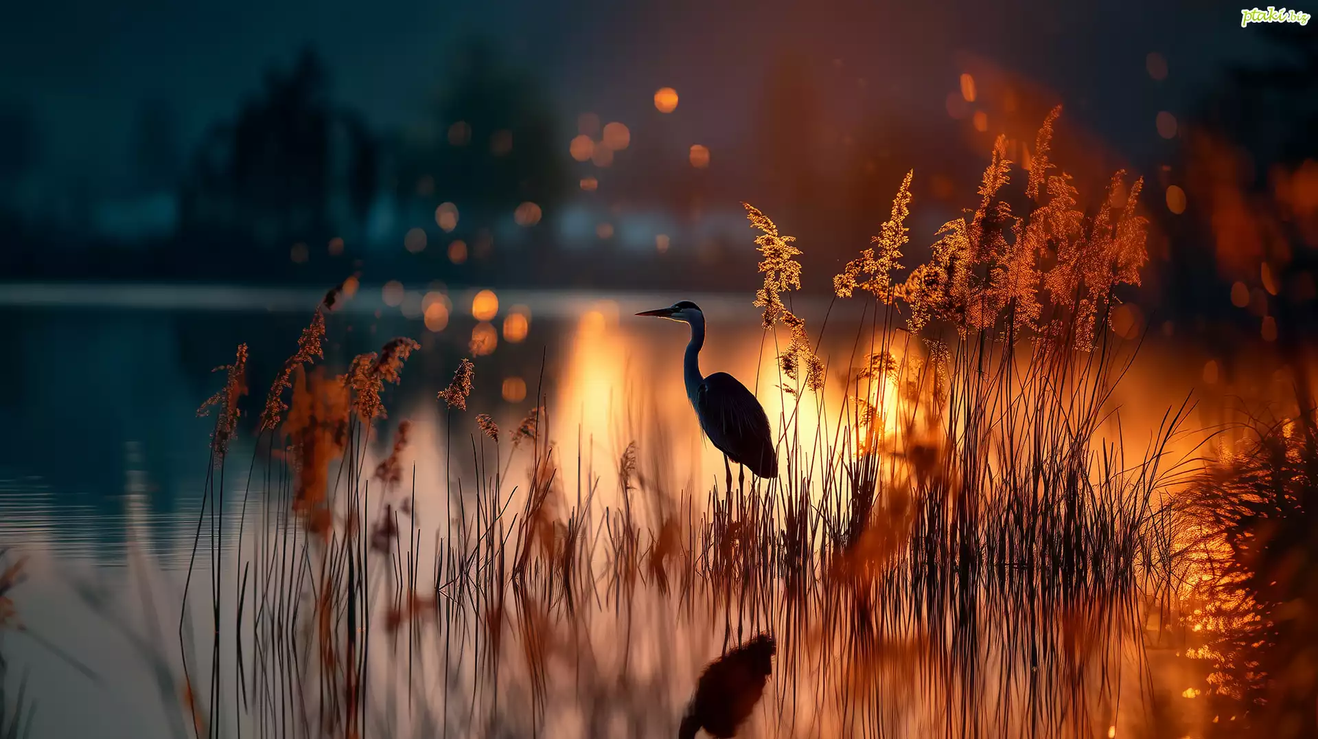 Czapla, Trawy, Woda, Zachód słońca, Grafika AI