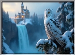 Sowa śnieżna, Świerk, Zamek, Wodospad Grafika AI