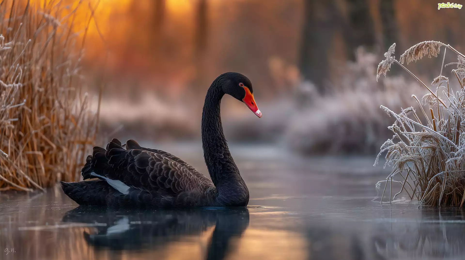 Czarny, Łabędź, Staw, Zarośla, Grafika AI