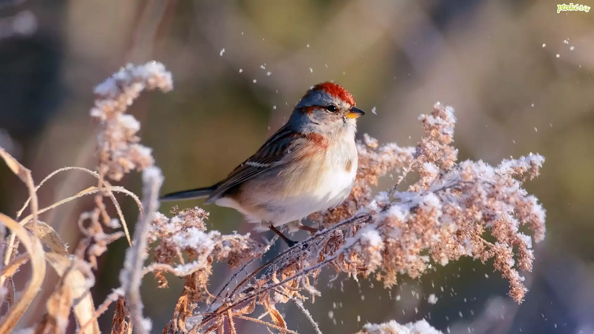 Zima, Ośnieżona, Roślina, Ptak, Czeczotka