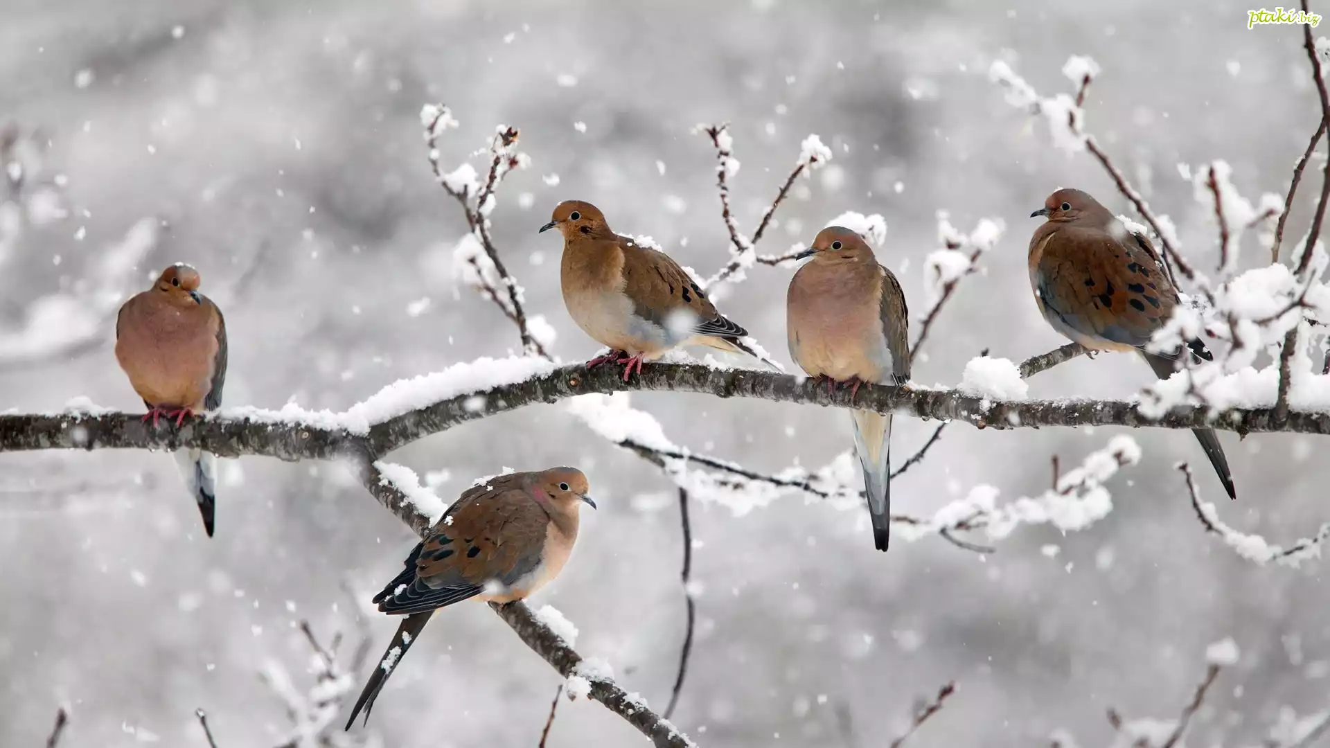 Zima, Śnieg, Gałęzie, Drzewo, Ptaki, Gołębie