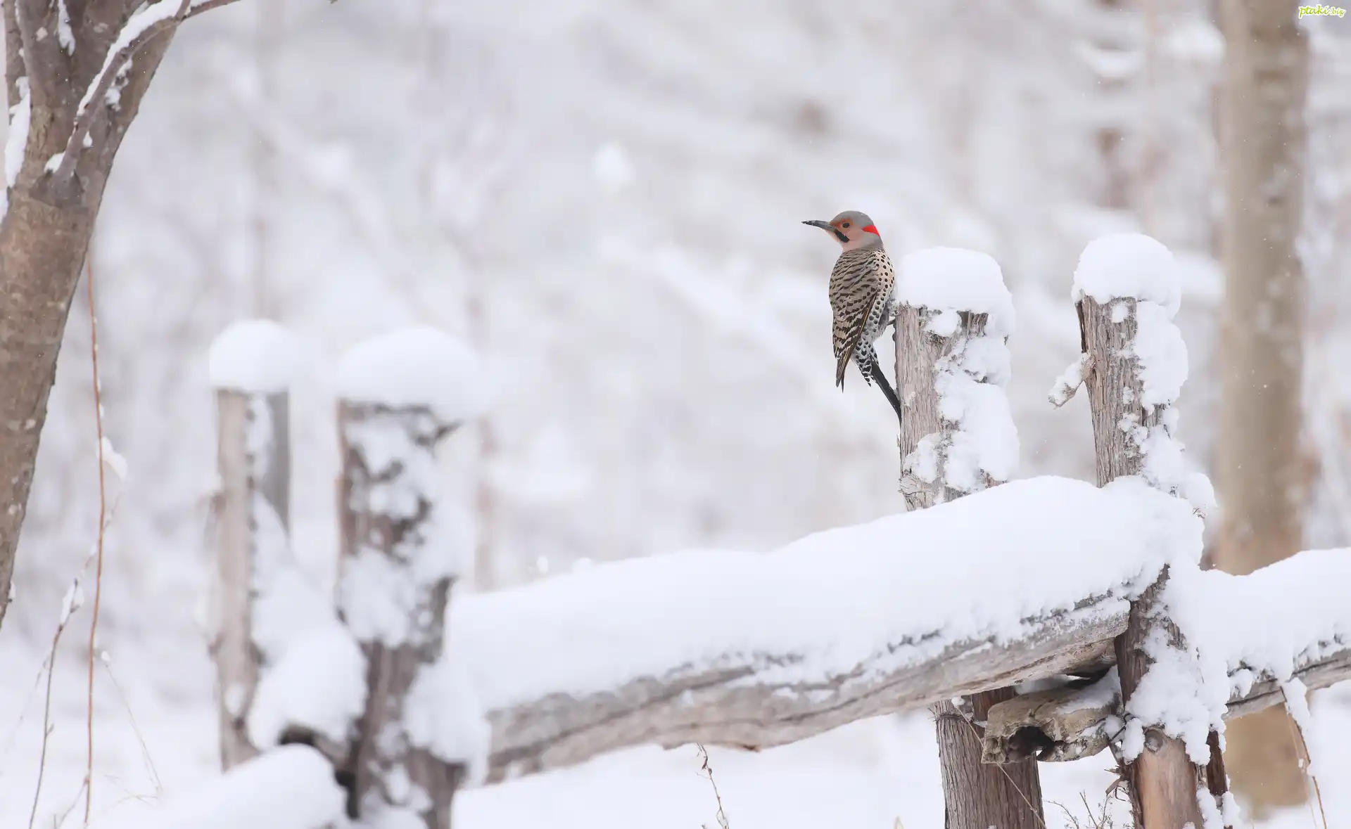 Ptak, Dzięcioł różowoszyi, Zima, Śnieg, Drewniane, Ogrodzenie