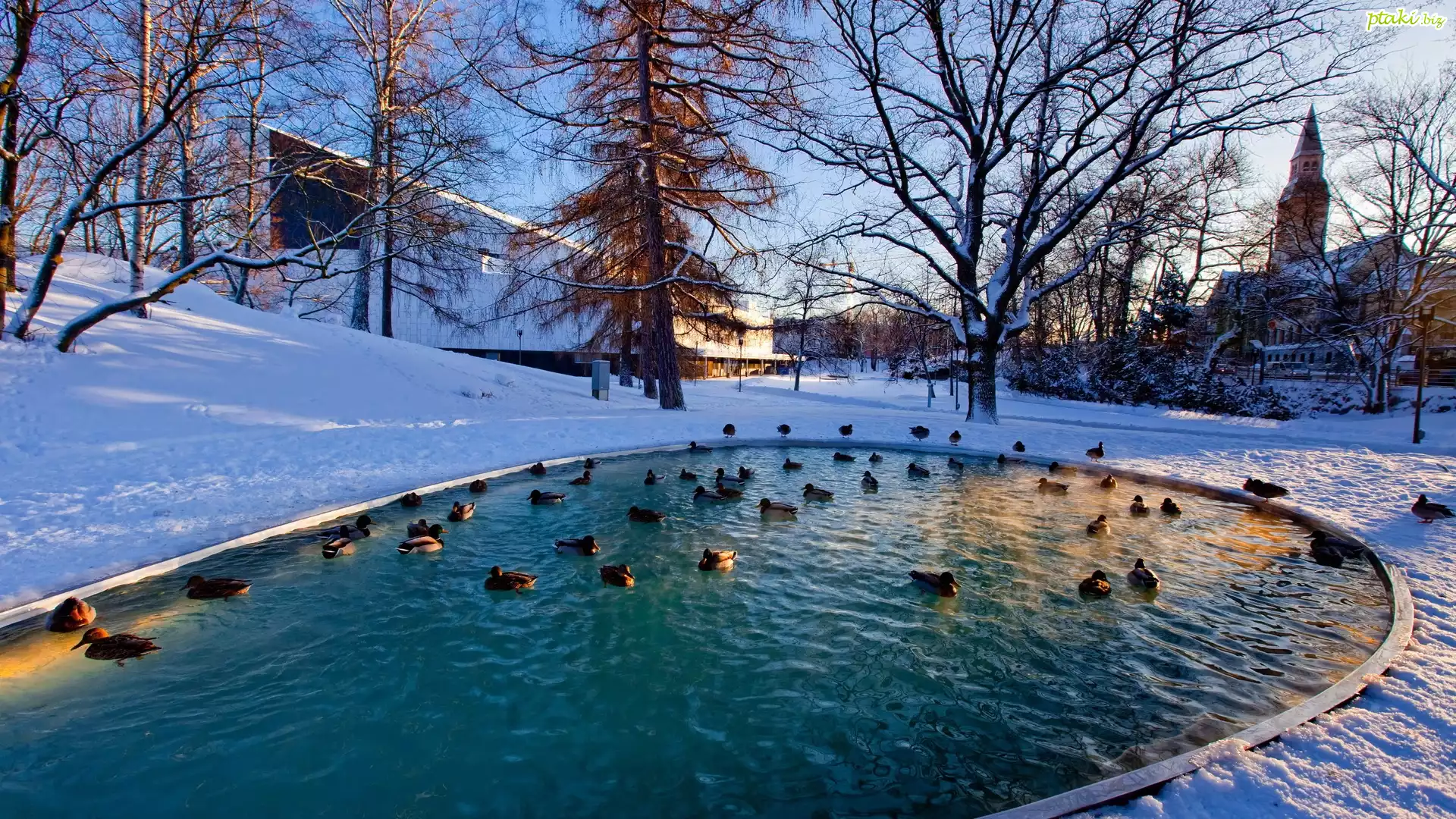 Zima, Park, Drzewa, Staw, Kaczki